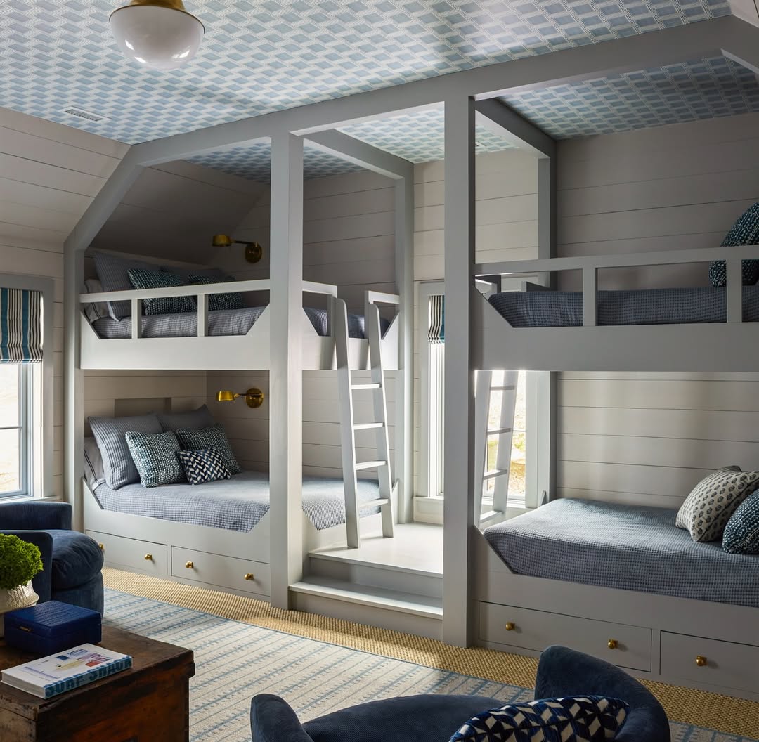 Step-up platforms and built-in ladders give this six-bed layout the feel of a mini camp cabin—minus the splinters. A blue plaid ceiling draws the eye up and adds pattern without cluttering the walls. Brass sconces, roomy drawers, and matching window shades keep the whole look tight and tailored. Ideal for sleepovers, siblings, or a crowd that likes order with their fun.