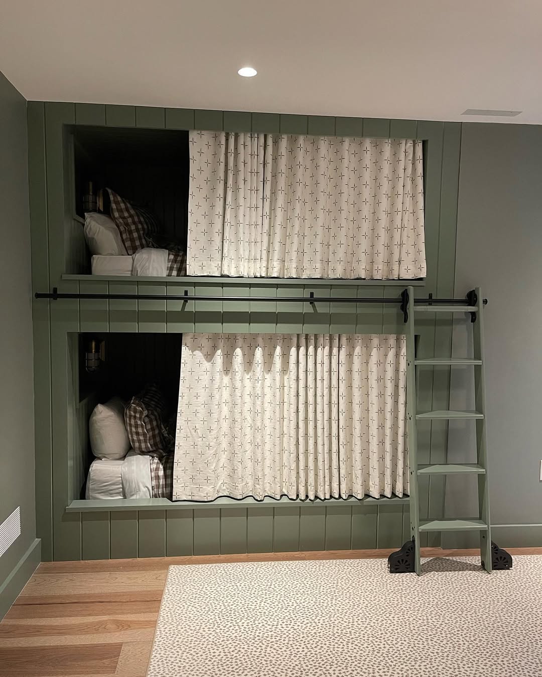 Dark sage paneling and privacy curtains give these bunks a cozy, built-in fort feel. Each nook feels intentionally tucked away—ideal for introverts or post-s’mores downtime. Plaid bedding and mini sconces amp up the cabin-core vibe, while the rolling ladder adds just the right touch of whimsy. A sleepover setup that’s secretly designed for solid rest.