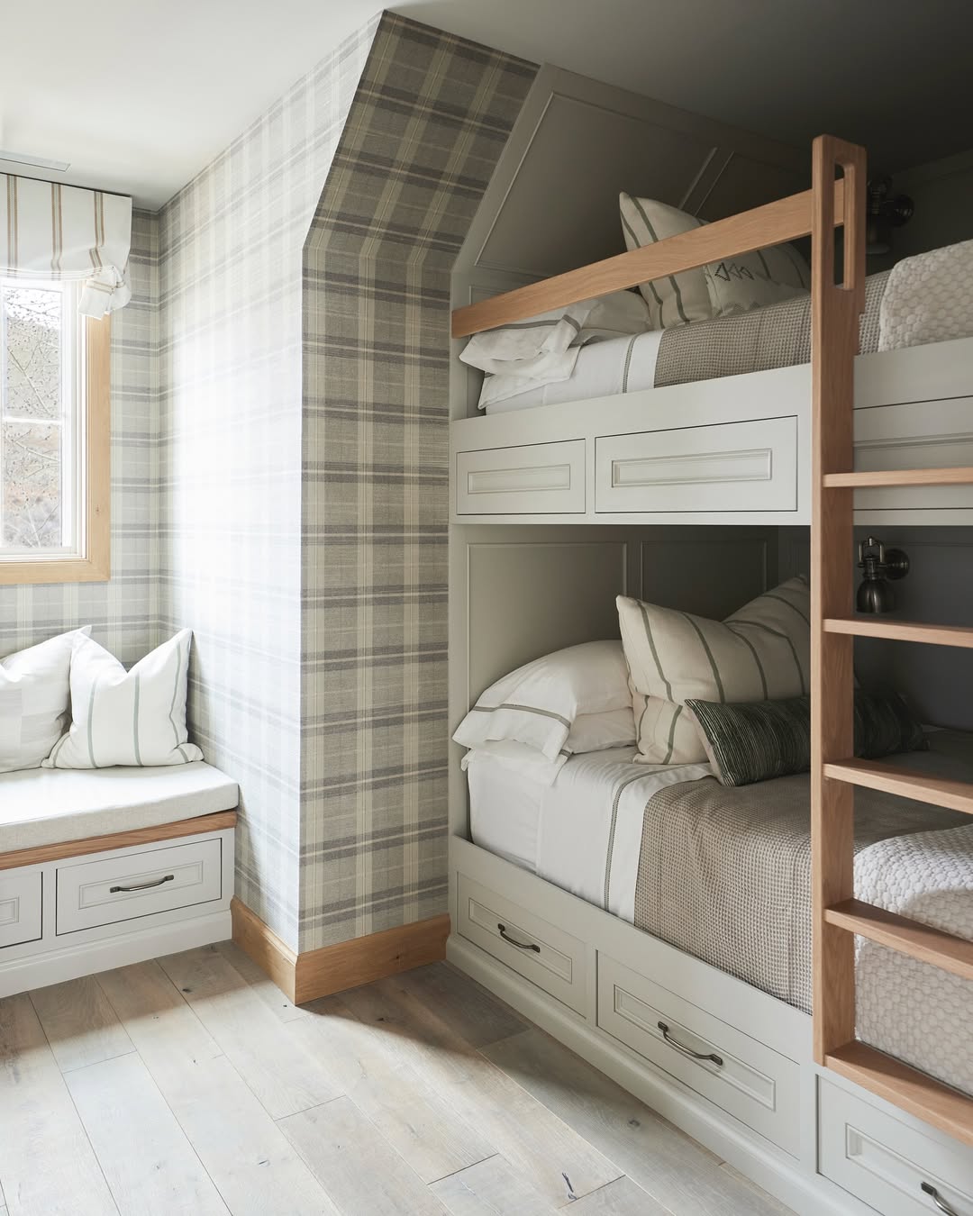 Plaid wallpaper, wood accents, and crisp millwork give this bunk room a classic, almost collegiate charm. The built-in bench is a smart bonus—ideal for reading, tying shoes, or escaping sibling chatter. Soft neutrals keep things serene, while the wood ladder and rail add just enough contrast. It’s buttoned-up, but still feels like home.