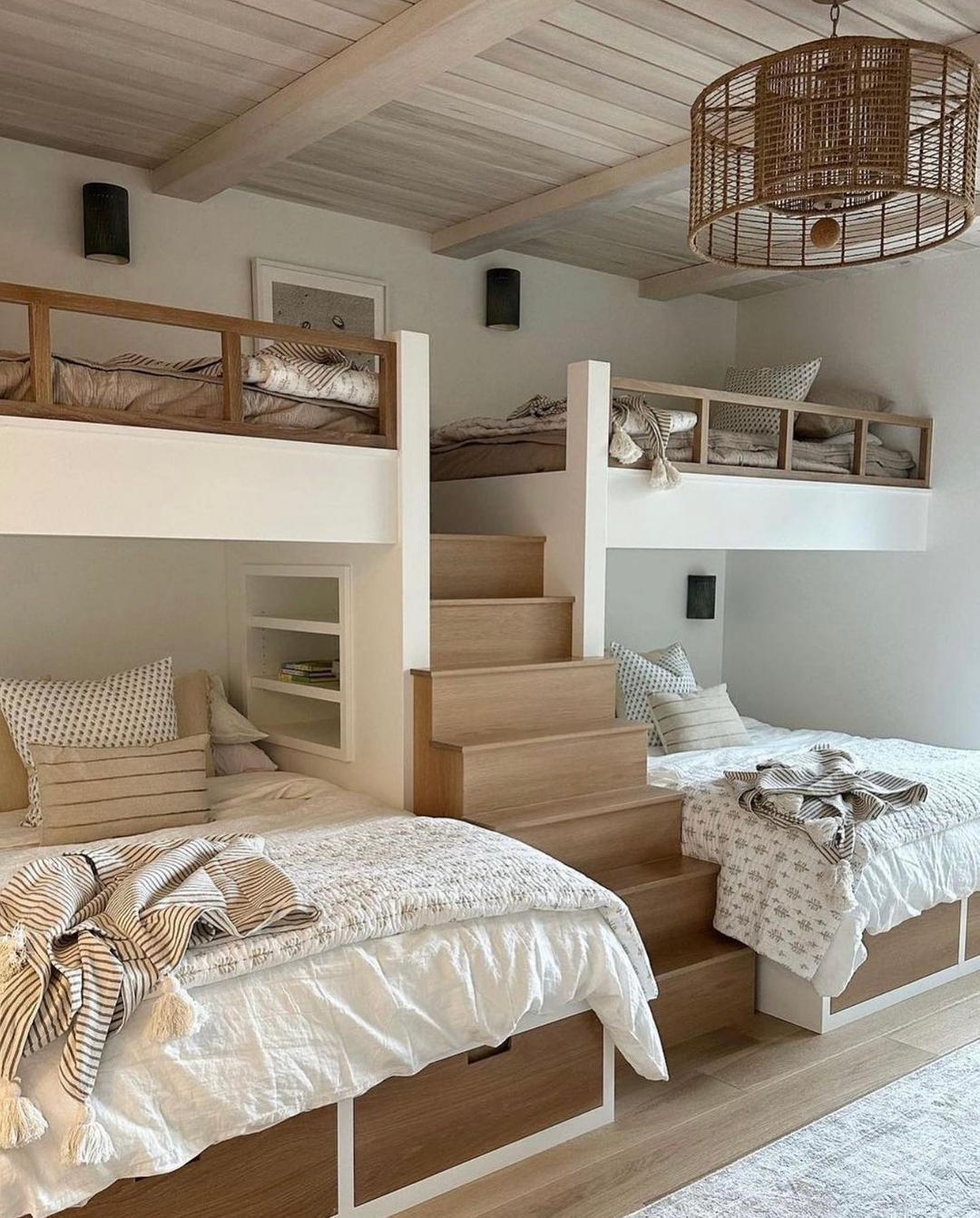 Layered wood tones, soft whites, and simple lines turn this four-bed bunk setup into a minimalist’s dream. The central staircase feels architectural and anchors the layout without eating up space. Built-in bookshelves at pillow height add a custom touch—and encourage bedtime reading. Even the ceiling gets in on the vibe with pale planks and exposed beams that tie it all together.