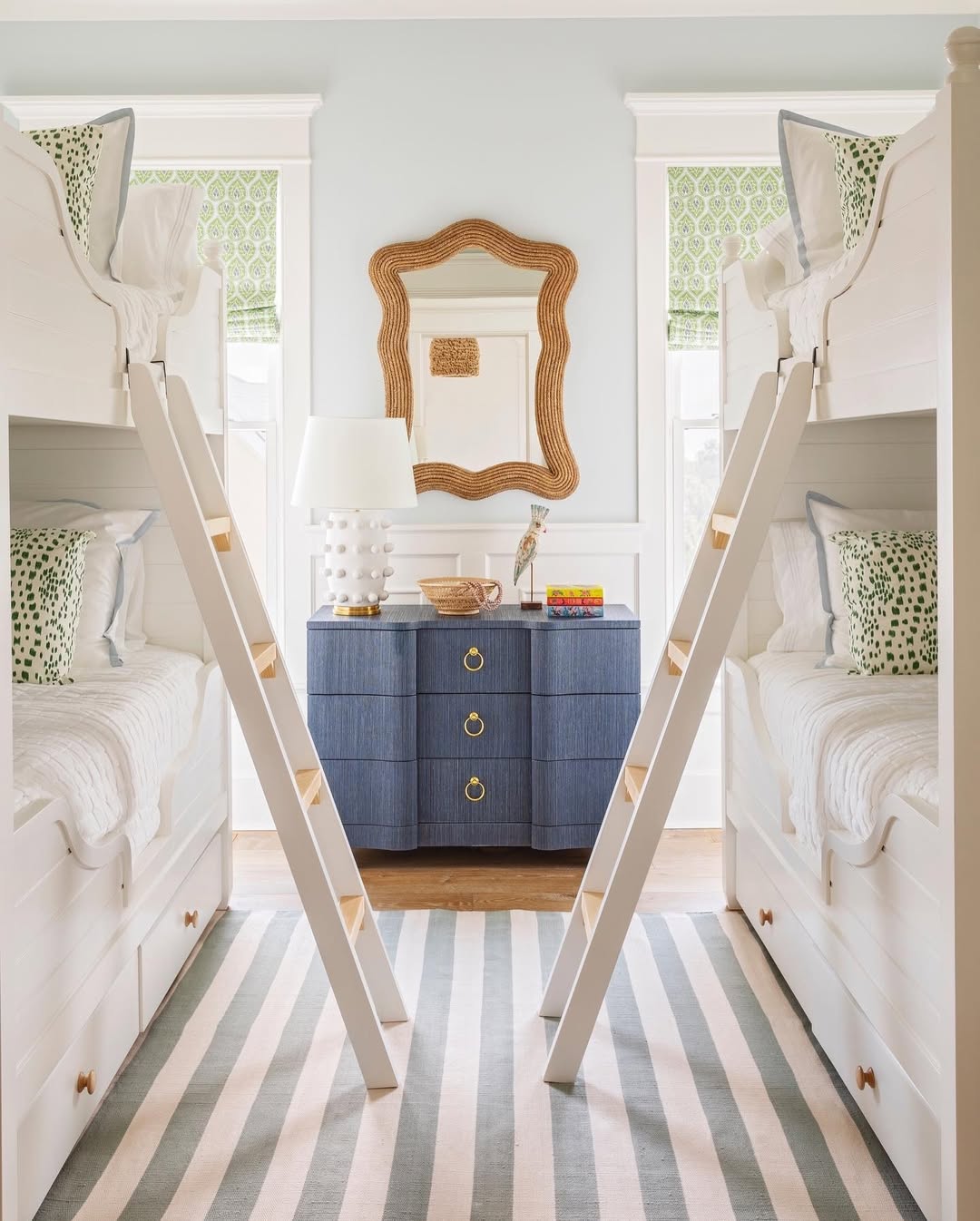 Minty green prints, soft blue walls, and crisp white bunks keep the palette fresh without trying too hard. A denim-textured dresser and wavy rope mirror add a dose of grown-up fun. Everything’s symmetrical, but nothing feels stiff. Even the striped rug knows how to keep it casual.