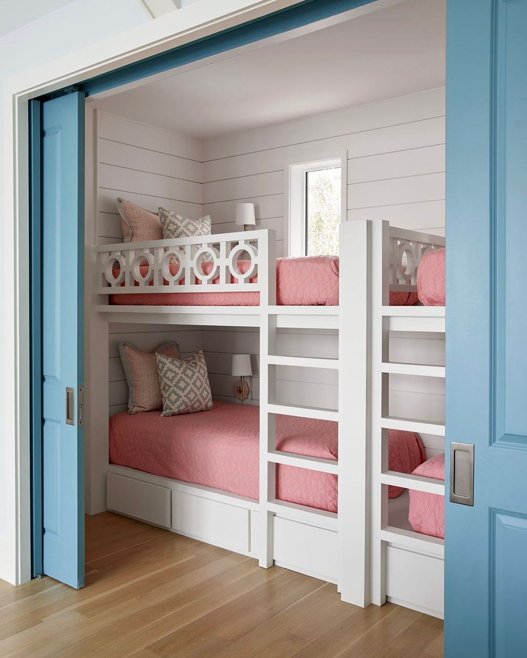 Built-in bunks turn this compact nook into a sleepover dream. Crisp white shiplap and coral bedding keep things bright, while the circle-cut guardrails add just the right amount of play. Blue pocket doors tuck it all away when needed (or when noise levels hit a 10). Pro move: drawers under each bed double as storage for toys or beach towels.