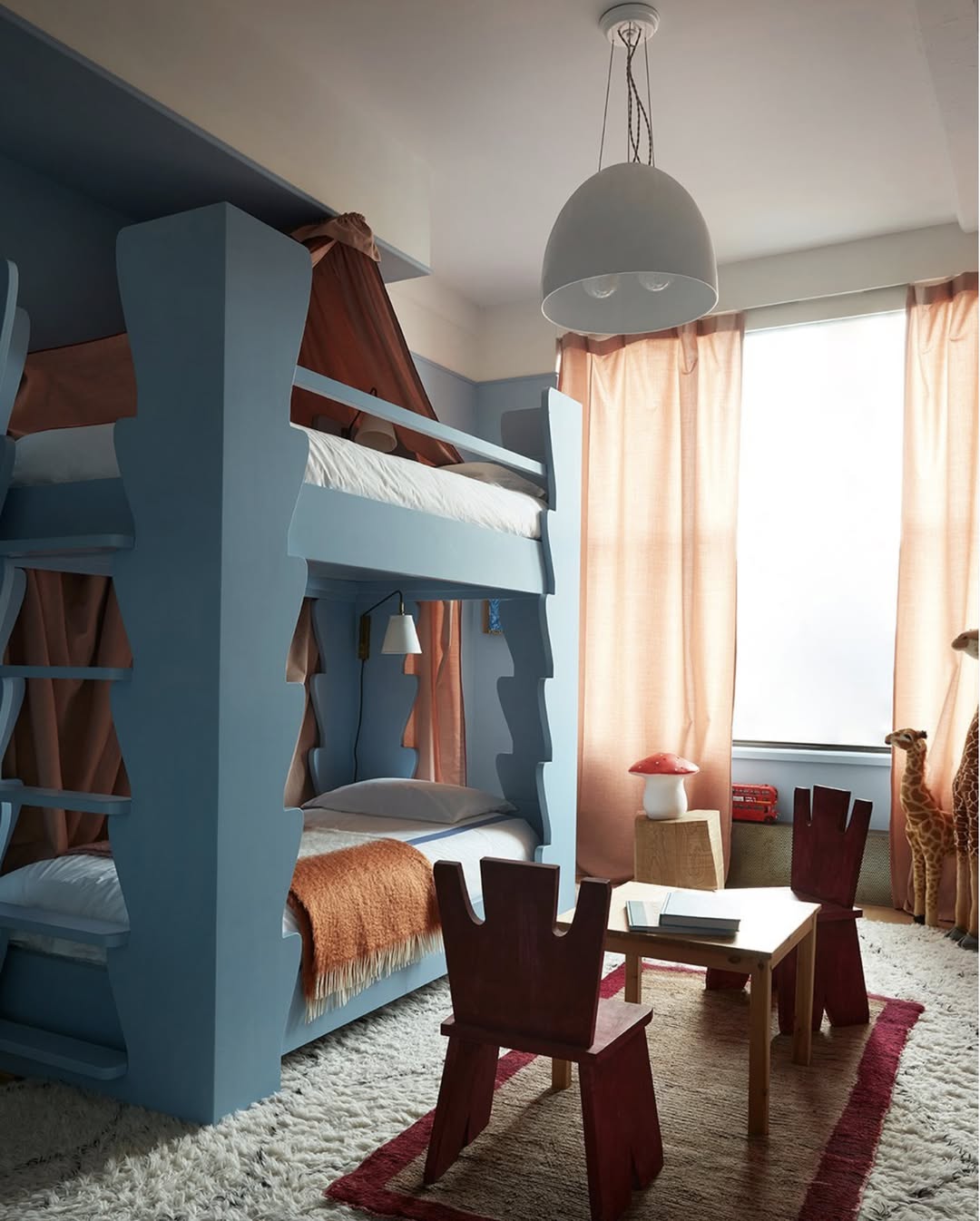 Chunky blue bunks with scalloped edges feel straight out of a Saturday morning sketch—fun, bold, and unapologetically playful. Terracotta curtains and an orangey throw warm up the cool tones and soften the space. Sculptural kid-size chairs give major design cred without losing the whimsy. Every corner’s got character—even the giraffe.