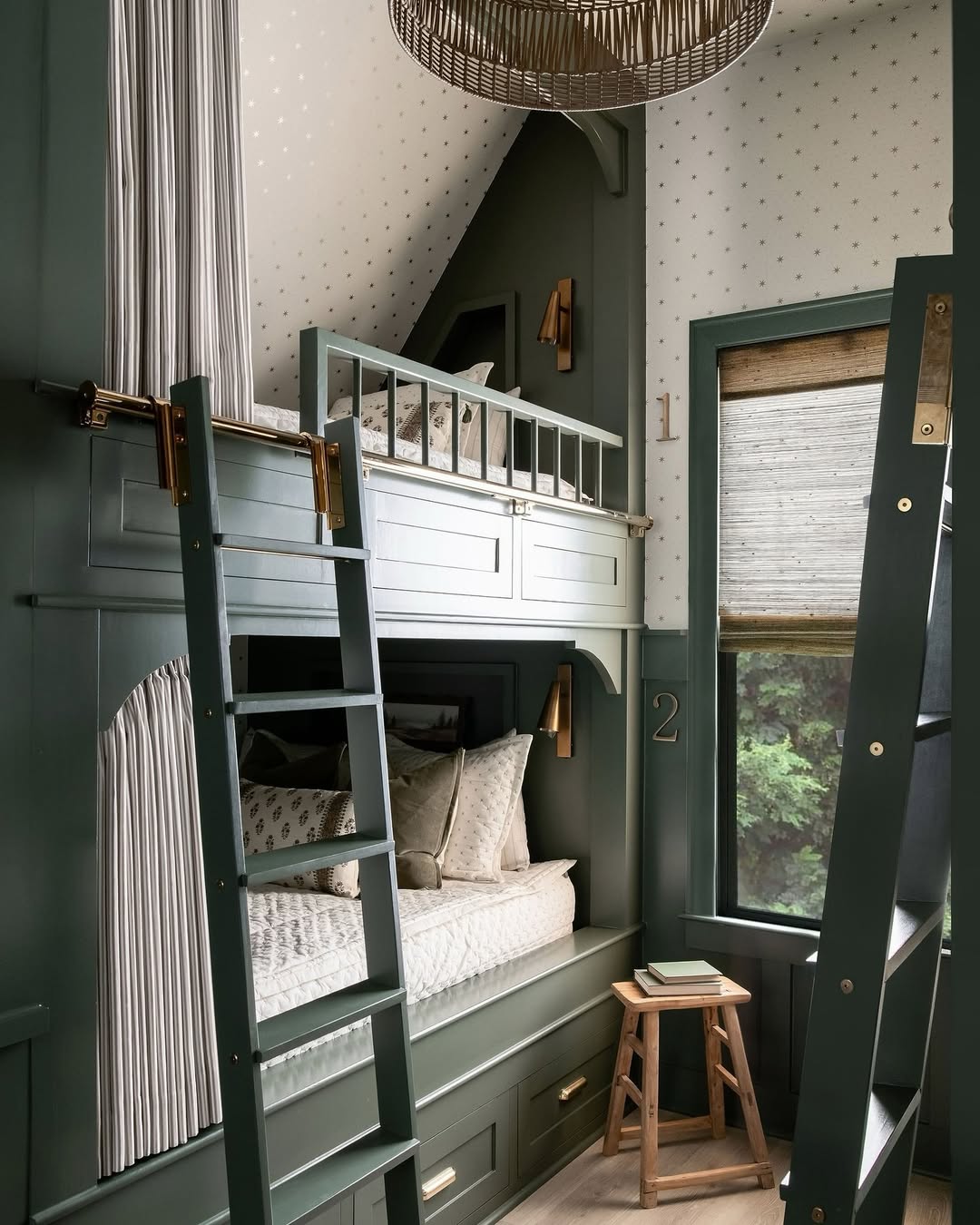 Deep green millwork, brass accents, and tailored curtains turn this bunk nook into something seriously special. Each bed gets its own reading light, number plate, and privacy moment—no fighting over favorites here. Built-in drawers and starry wallpaper round out the charm. It’s equal parts cabin retreat and old-school train car in the best way.