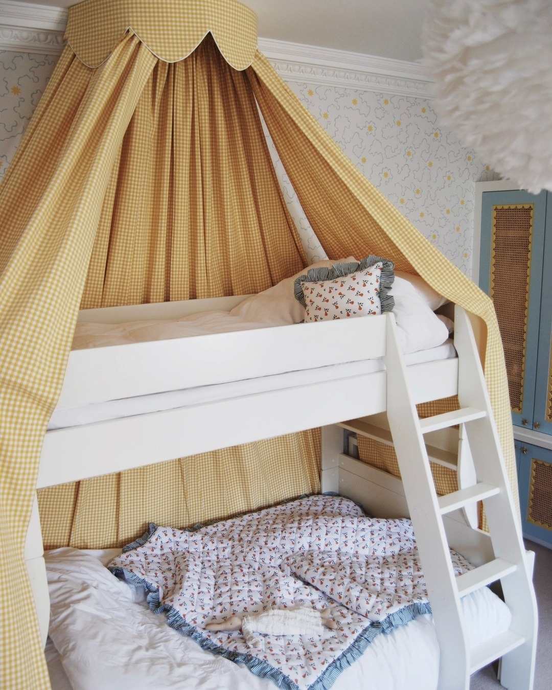 Sunny yellow drapery turns this basic bunk into a whimsical hideaway, complete with scalloped edges that feel straight out of a vintage storybook. Tiny floral prints and ruffled trim layer in cottagecore sweetness without going overboard. Even the built-in book nook feels like part of the fantasy. It’s giving sleepover meets theater set—in the best way.