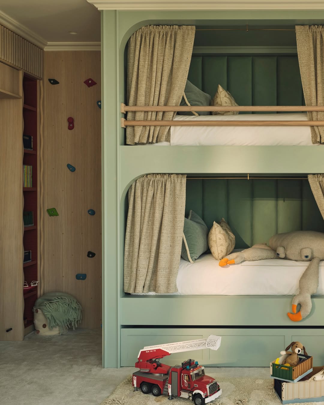 Rounded bunks in soft sage green bring just the right mix of calm and cool. Upholstered back panels and curtain rails turn each bed into a private little den. A mini rock wall on the side nods to adventure, while wood details keep things grounded and timeless. It’s equal parts playroom and wind-down zone—built to grow with them.