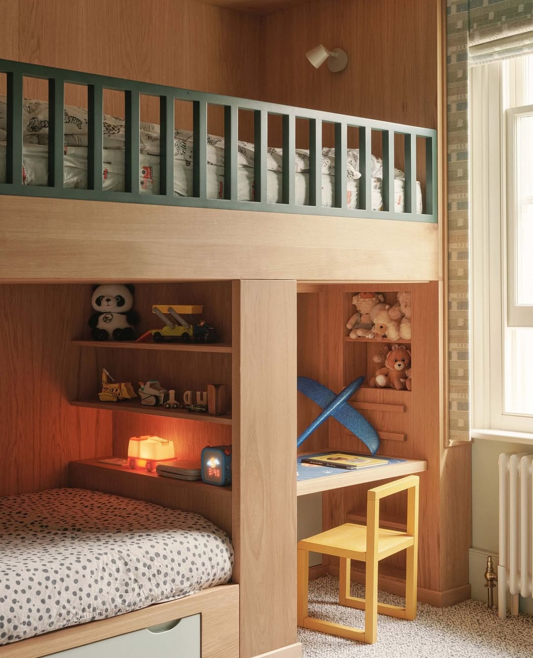 Light oak paneling keeps the look warm and modern, while the deep green guardrail adds just the right hit of contrast. A lower bunk wraps around a built-in desk and toy shelf, turning the corner into a multifunctional kid zone. The yellow chair pops without overwhelming the palette. Smart, space-savvy, and totally kid-approved.