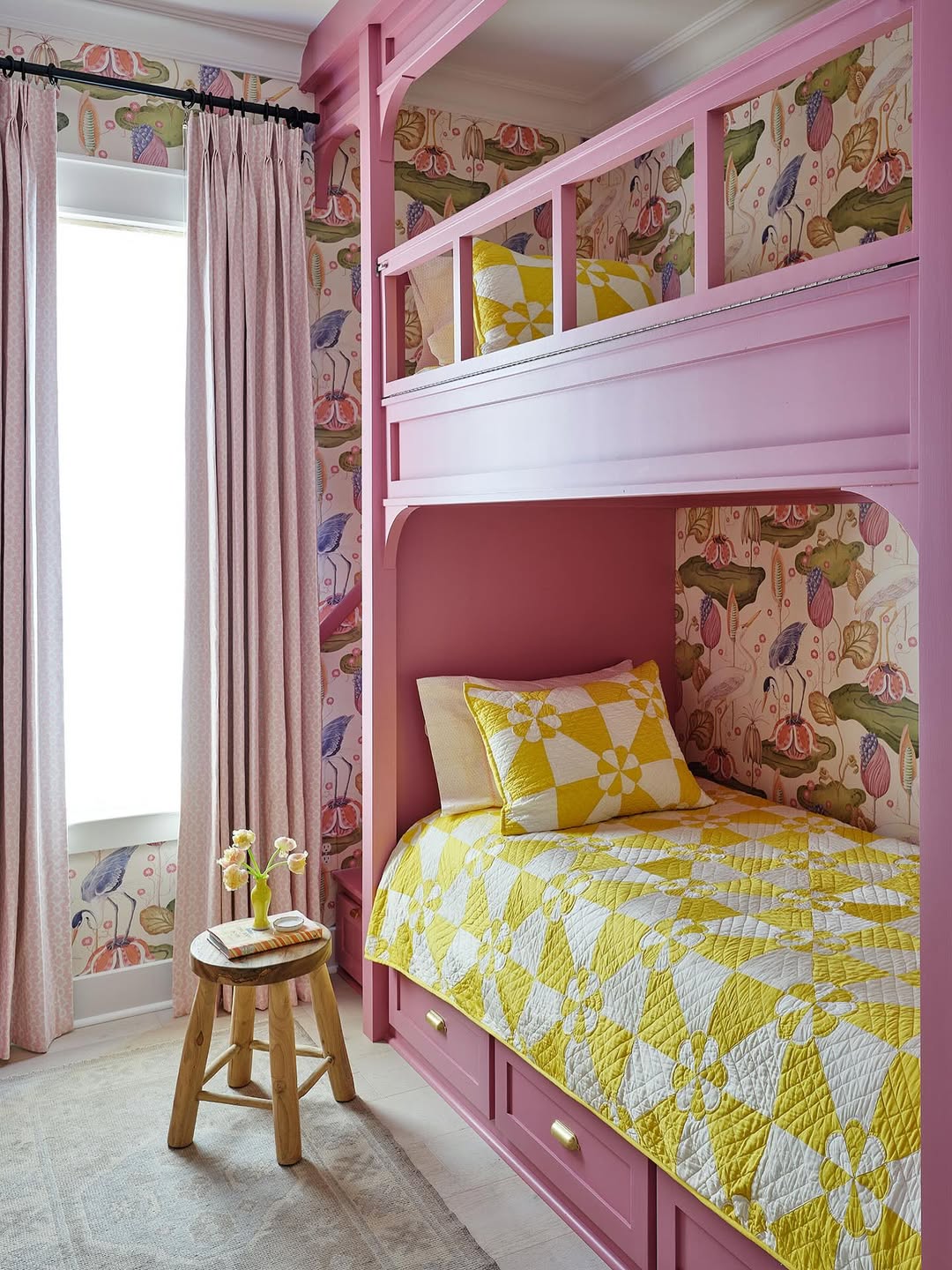 Pink built-ins and bold wallpaper bring full storybook energy to this bunk room. The yellow-and-white quilt adds a jolt of cheer—and keeps the palette from leaning too sweet. Built-in drawers below are secretly practical, while the natural wood stool reins in all the color with a grounding touch. It’s playful, but not chaotic.