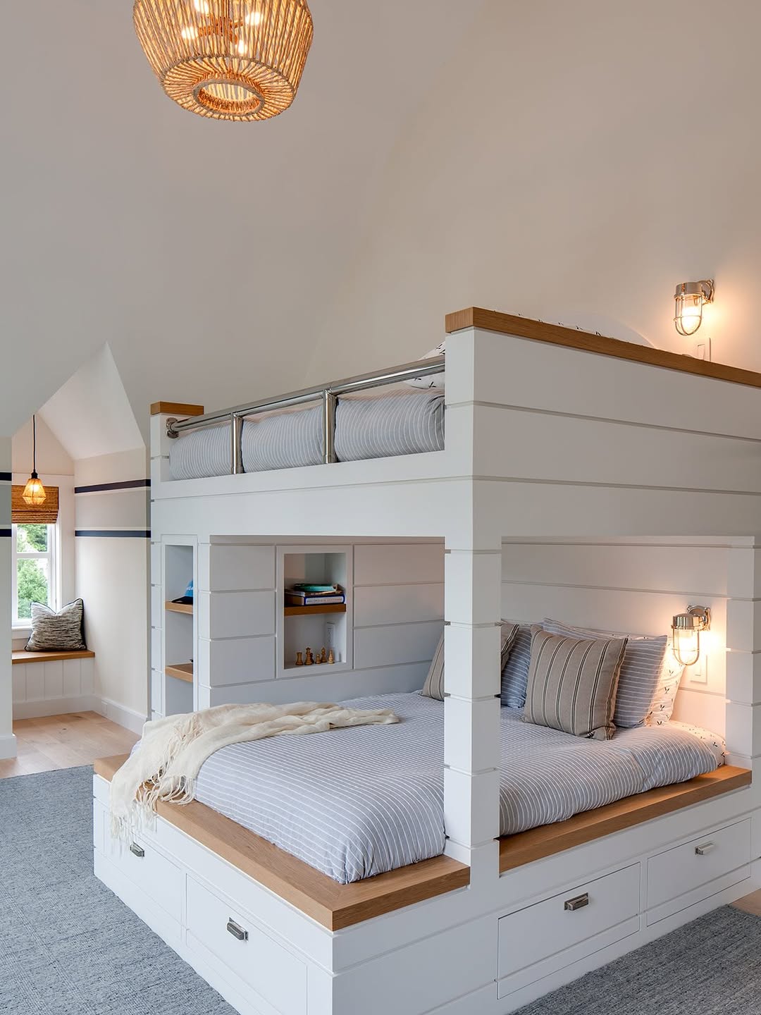 This bunk setup nails the balance between cozy and clean. White shiplap, integrated shelving, and nautical sconces give it a coastal-cabin vibe without feeling themed. The oak trim detail adds warmth—and gives each bed a defined edge (literally). Drawers below? Always a win in kid zones or guest rooms.