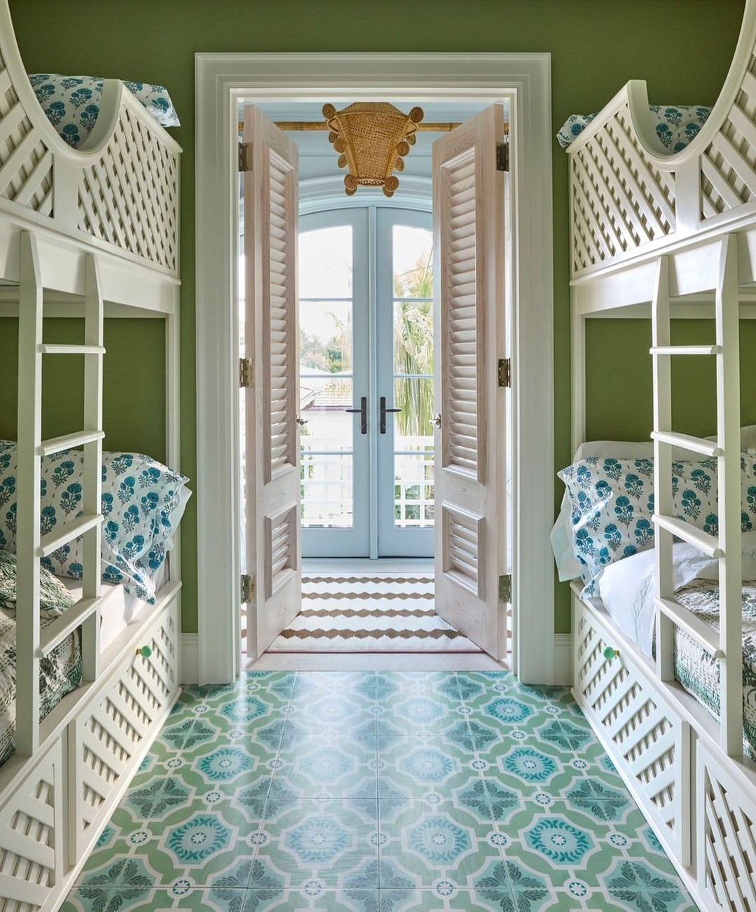 Patterned tile floors and arched bunk rails make this room feel like a tropical hideaway. The symmetry is tight, but nothing feels stiff—thanks to breezy louvered doors and playful textiles. Built-ins keep the footprint efficient, leaving just enough space to dance barefoot on that minty tile. It’s giving vacation mode, permanently.