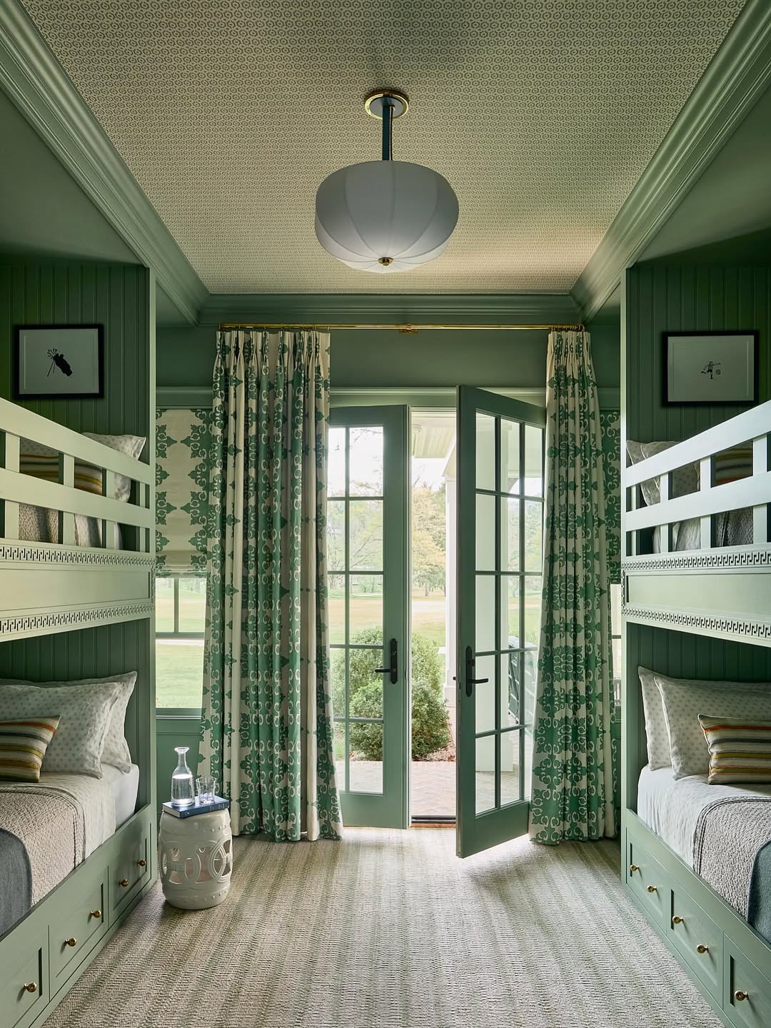 This bunk room leans fully into green, and somehow, it works at every level—walls, trim, drapes, even the French doors. Brass knobs and patterned ceiling wallpaper add polish without stealing focus. The built-ins are crisp and symmetrical, but the textures (hello, grasscloth rug and soft roman shades) keep it feeling grounded. Basically, it’s a country club sleepover in room form.