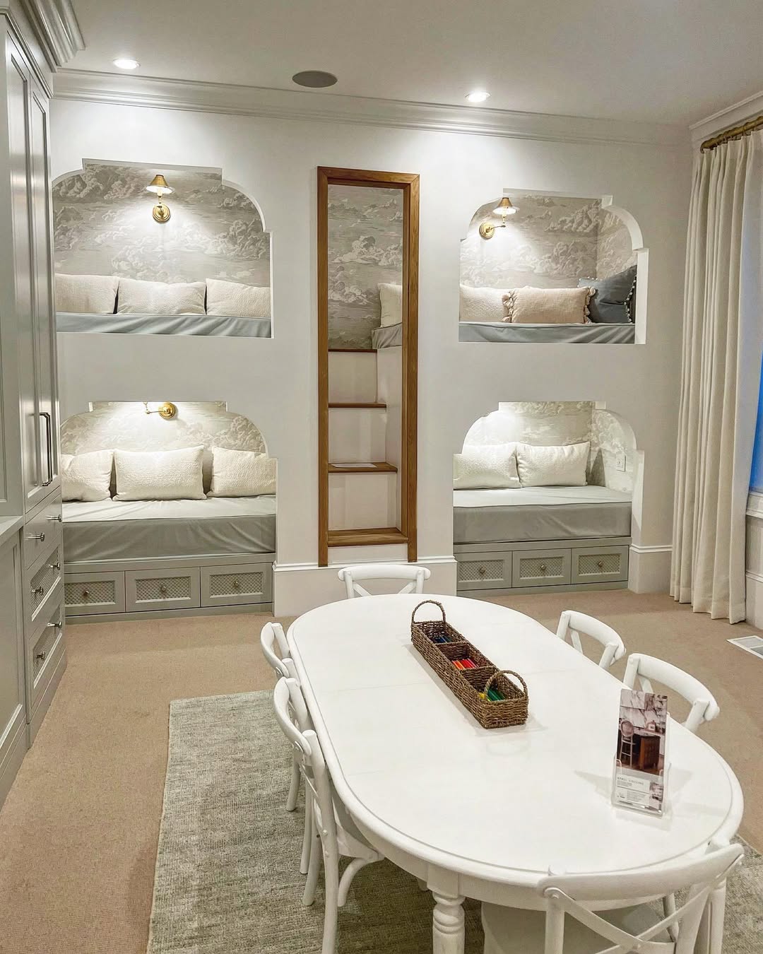 Arched bunks and toile wallpaper give the whole room a dreamy, tucked-in feel. Built-in lighting and soft neutrals make each bed feel like its own little escape pod—equal parts cozy and elevated. The central table says crafts by day, cards by night, all within arm’s reach of nap zones. Smart design move: mesh-front drawers under each bed add airflow and a hint of texture.