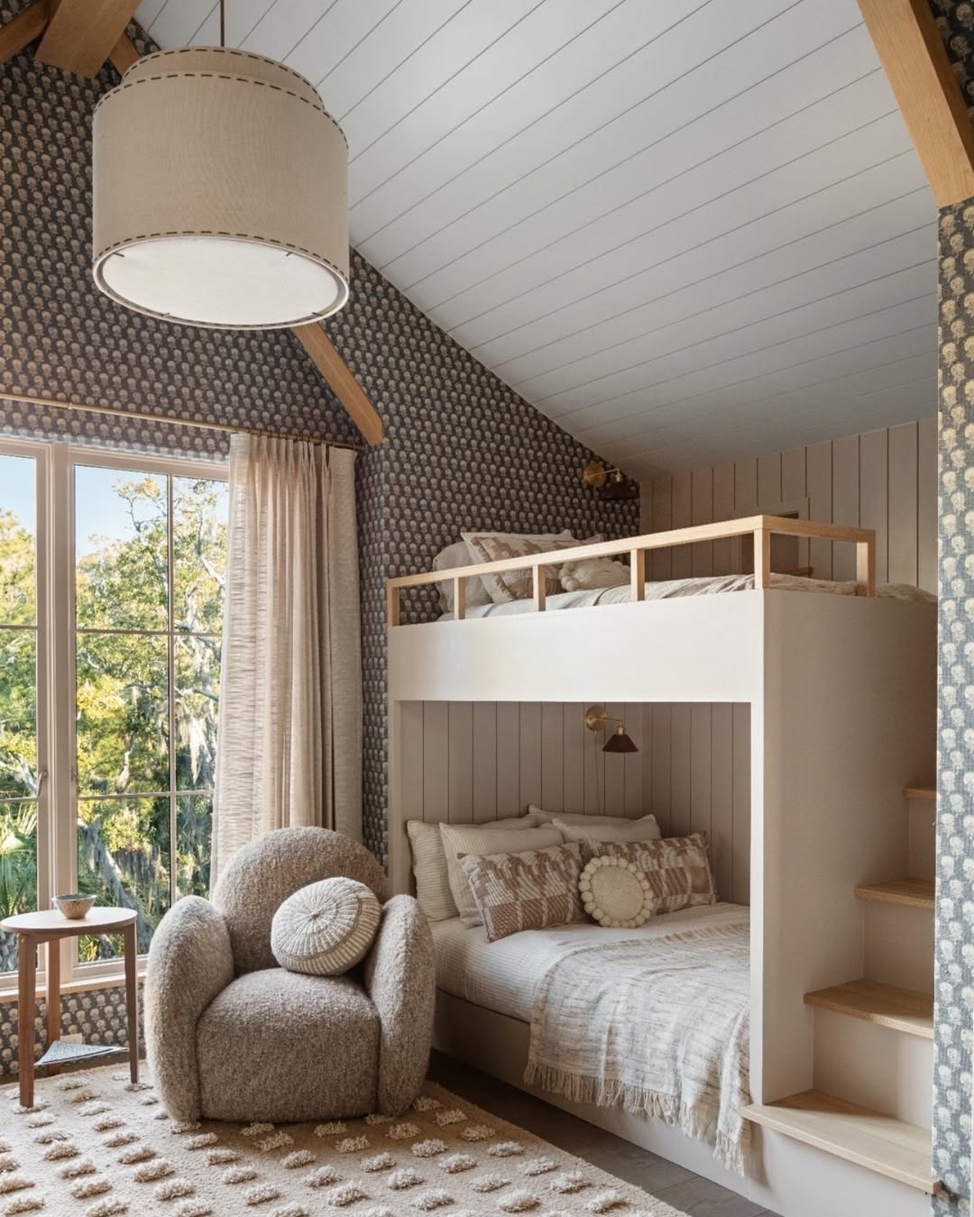 Layered neutrals, natural light, and cozy textures make this bunk room feel more boutique hotel than kids’ zone. A built-in staircase trades ladders for safety (and style), while tongue-and-groove paneling adds subtle structure. That boucle chair and pom-pom rug? Pure tactile joy. Even the wallpaper keeps things soft, grounding the space without overwhelming it.