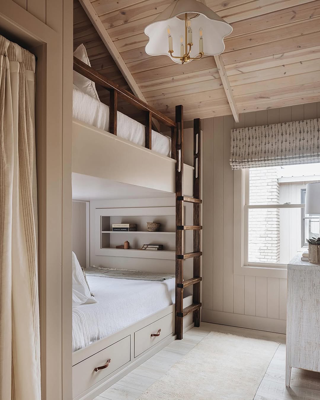 Tone-on-tone wood paneling sets a peaceful, tonal base that’s anything but boring. A walnut ladder and leather drawer pulls bring contrast—and just enough edge. Open shelving at the foot of the lower bunk makes room for bedtime reads and tiny treasures. Even the scalloped light fixture nods to softness in a space that’s all about quiet charm.