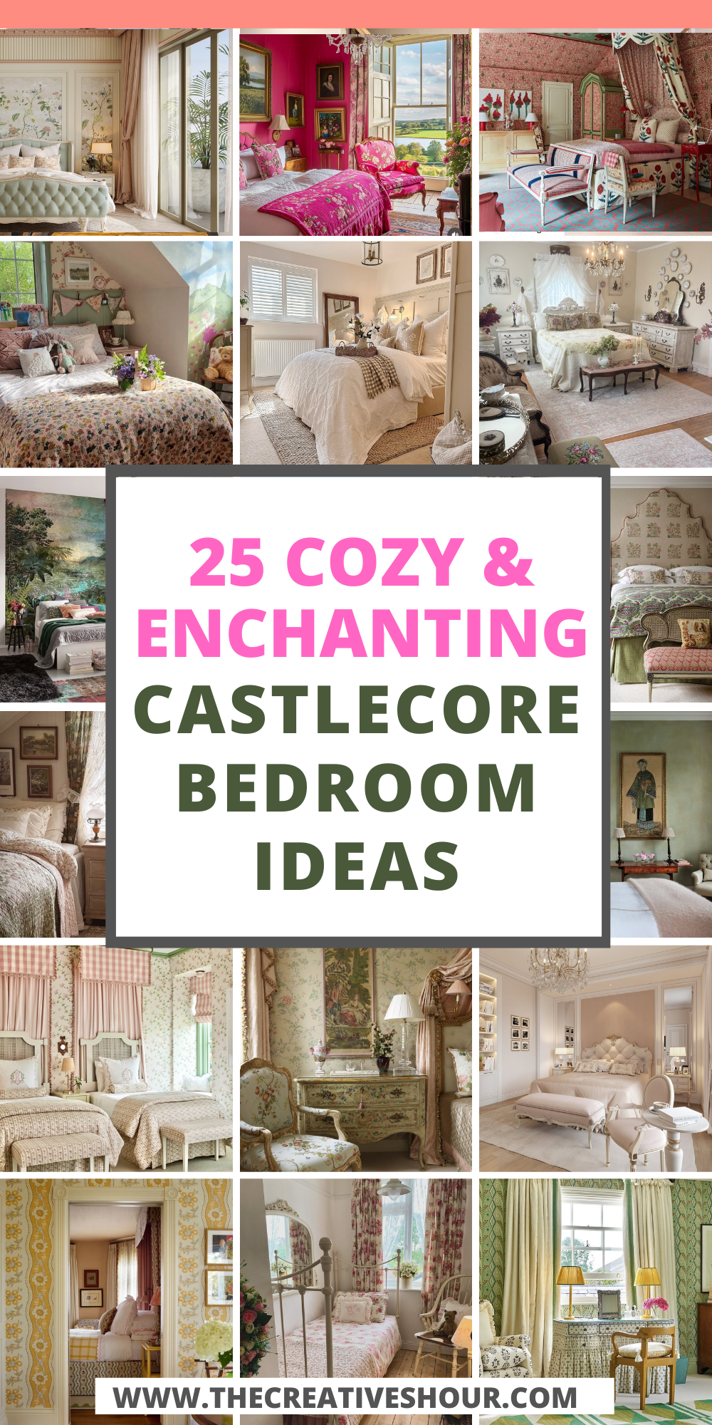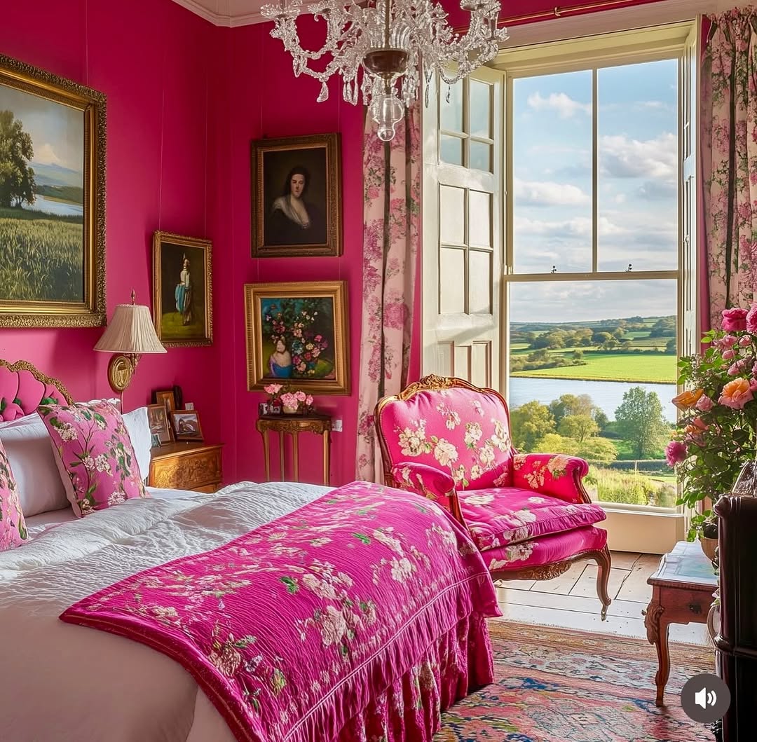 Hot pink walls and matching florals take this castlecore bedroom from prim to unapologetically bold. Gilded frames and oil portraits ground the look in period charm, while the floral upholstery leans full-on English romantic. That antique settee by the window? Practically begging for a novel and a nap. Proof that maximalism can still feel cozy—especially with a countryside view this cinematic.