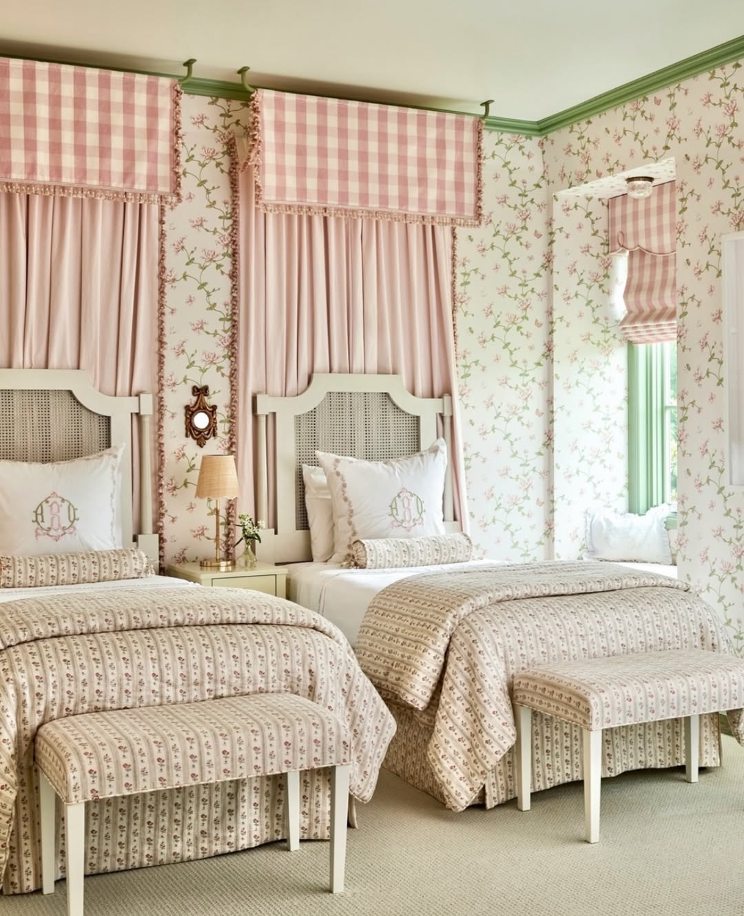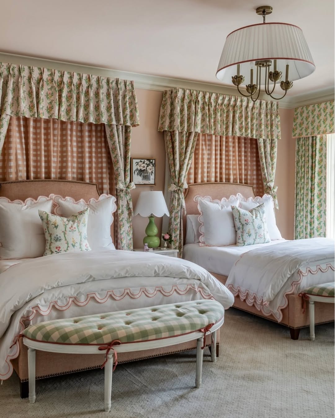 Twin beds get the royal treatment with pleated valances, botanical drapes, and scallop-trimmed linens. Blush tones balance the traditional shapes, giving the whole room a lifted, lighthearted feel. Gingham benches at the foot of each bed keep things sweet—not saccharine. It’s a floral fantasy with a touch of symmetry.