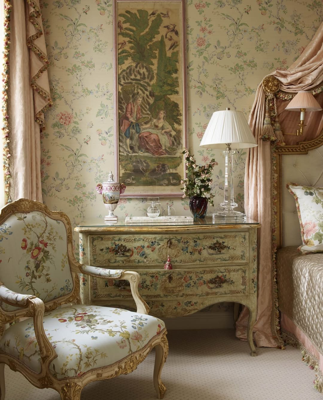 Hand-painted furniture, toile upholstery, and tasseled drapery make no apologies for their opulence. The antique tapestry sets a scene worthy of a rococo romance, while crystal lamps keep it all sparkling. Delicate florals on every surface feel curated, not cluttered. A little Louis XV, a lot of living history.