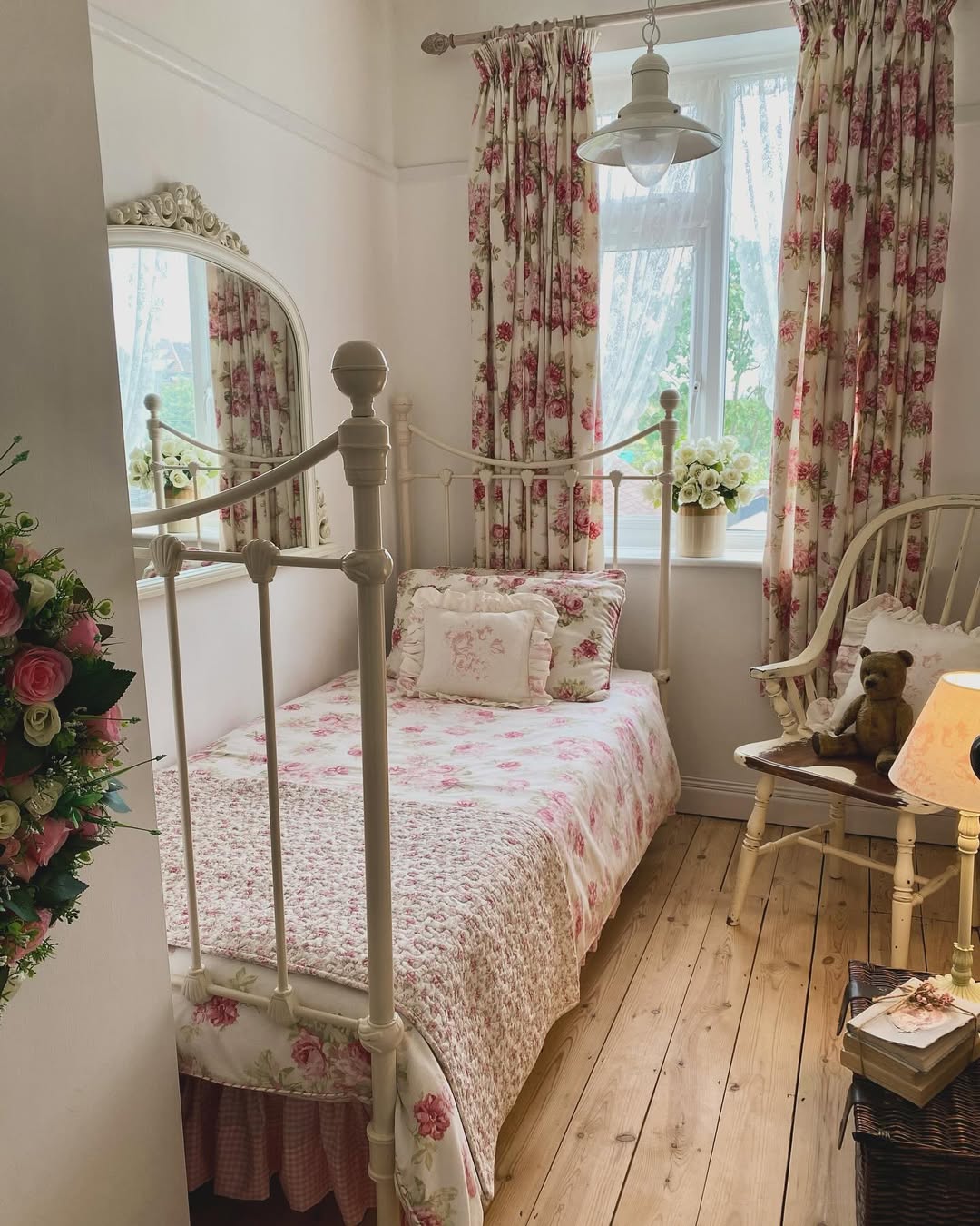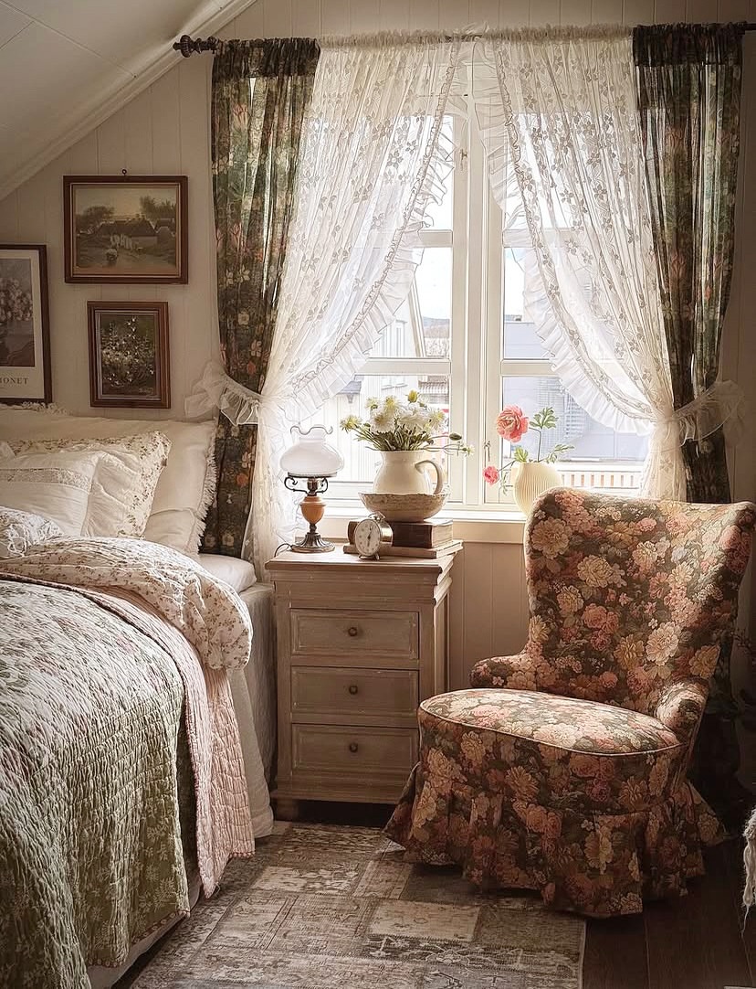 Vintage florals bloom across bedding, curtains, and even the lampshade in this petite charmer. The iron bed frame and blush palette channel that sweet, lived-in countryside energy. Ruffled pillows and gingham peeking from the bedskirt add playful layers. Small room, big fairytale energy.