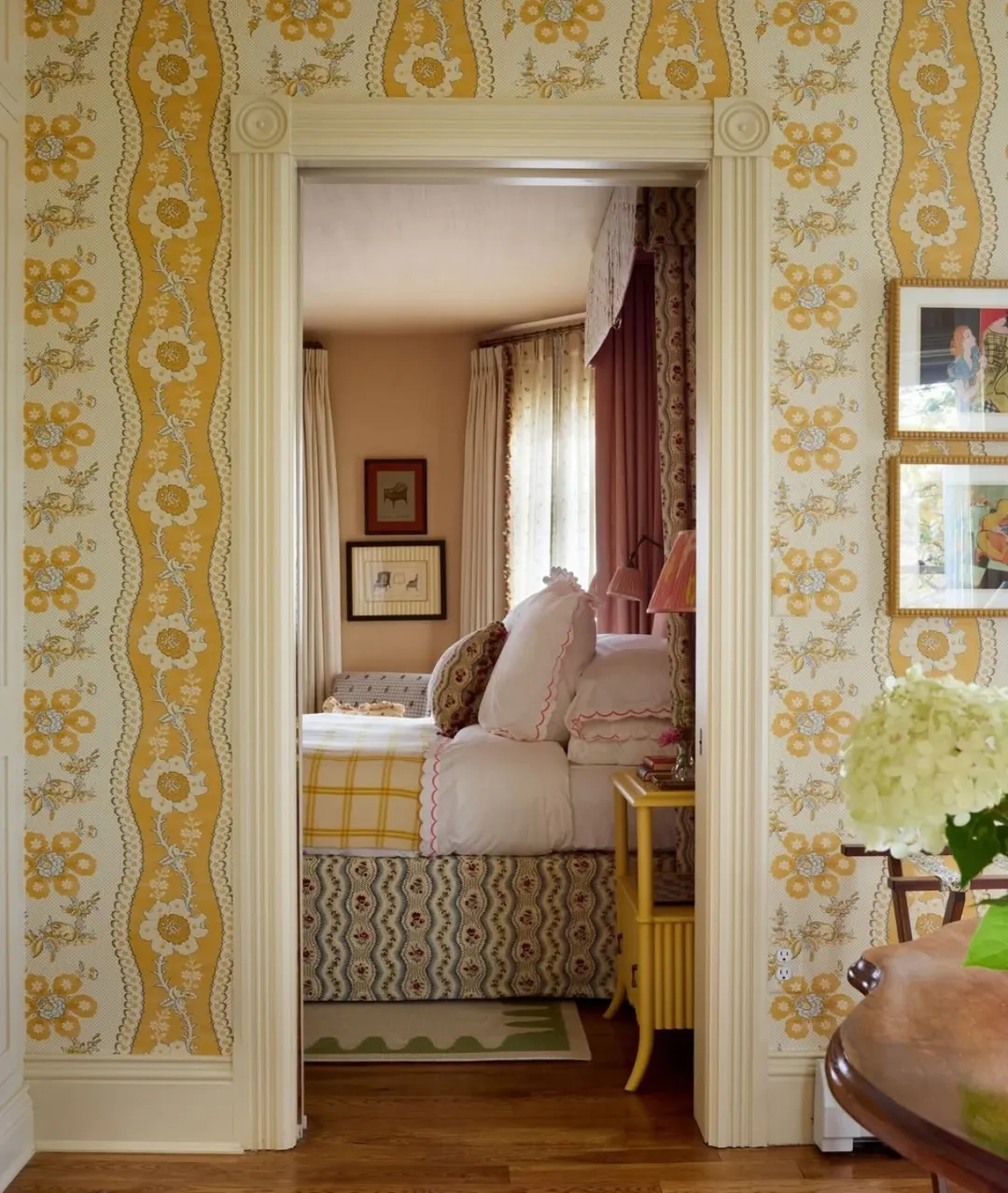 A glimpse through the doorway reveals a maximalist medley that somehow keeps its cool. Yellow checks, scalloped trims, and layered florals clash in the most coordinated way. The wallpaper doesn’t shy away either—it’s a cheerful escort into a richly dressed bed nook. Bold, playful, and unmistakably cottagecore royalty.