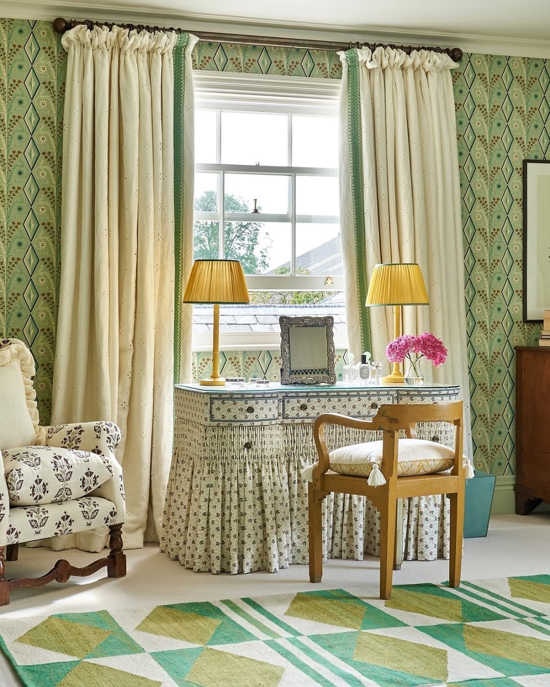 Geometric rugs, diamond wallpaper, and pleated skirts all pull from different centuries—and it works. Skirted tables soften the symmetry, while golden lamps bring a hint of courtly drama. The chair’s tassels are a subtle wink to traditional finery. Think of it as English manor gone maximalist.