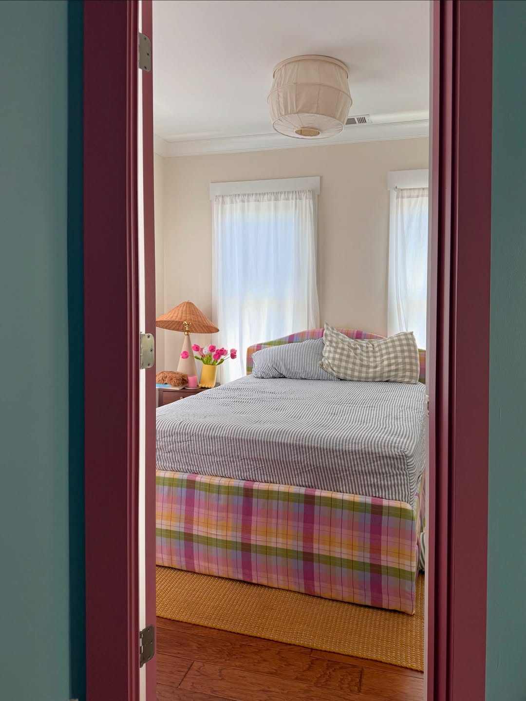 Peeking through the pink-trimmed doorway, this playful room offers a cheerful twist on period charm. A seersucker bedspread, gingham pillow, and pastel plaid skirt mix prints like it’s second nature. Rounded shades and fresh tulips make it feel young, not juvenile. It’s giving prep school meets afternoon tea.