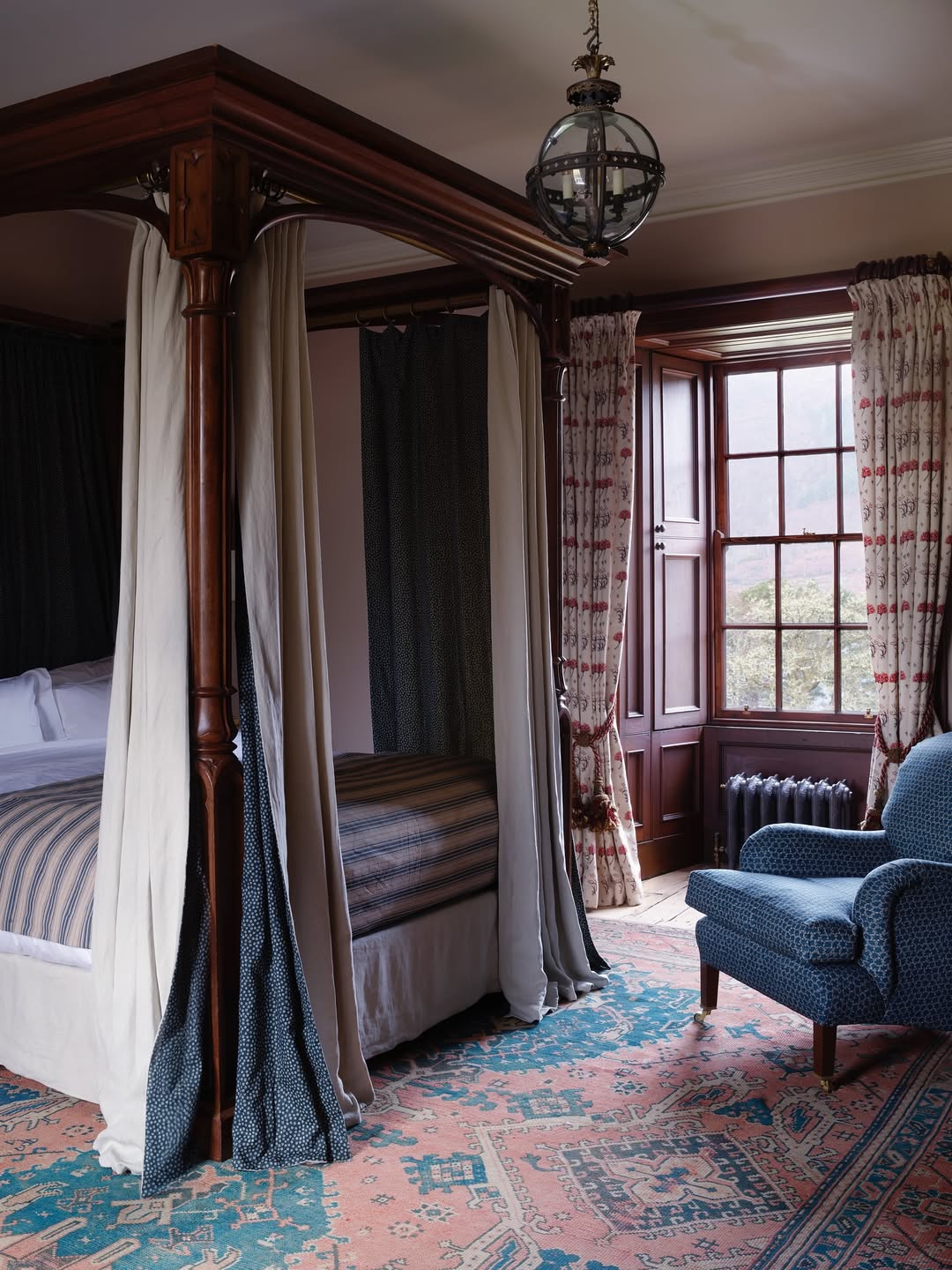 Mahogany wood, heavy curtains, and a moody palette give this bedroom serious Brontë energy. The four-poster bed cloaks in texture—from pinstripes to dark drapes—while the Persian-style rug pulls in just enough color. A tufted armchair by the window feels like the spot for letters never sent. Every element tells a story.
