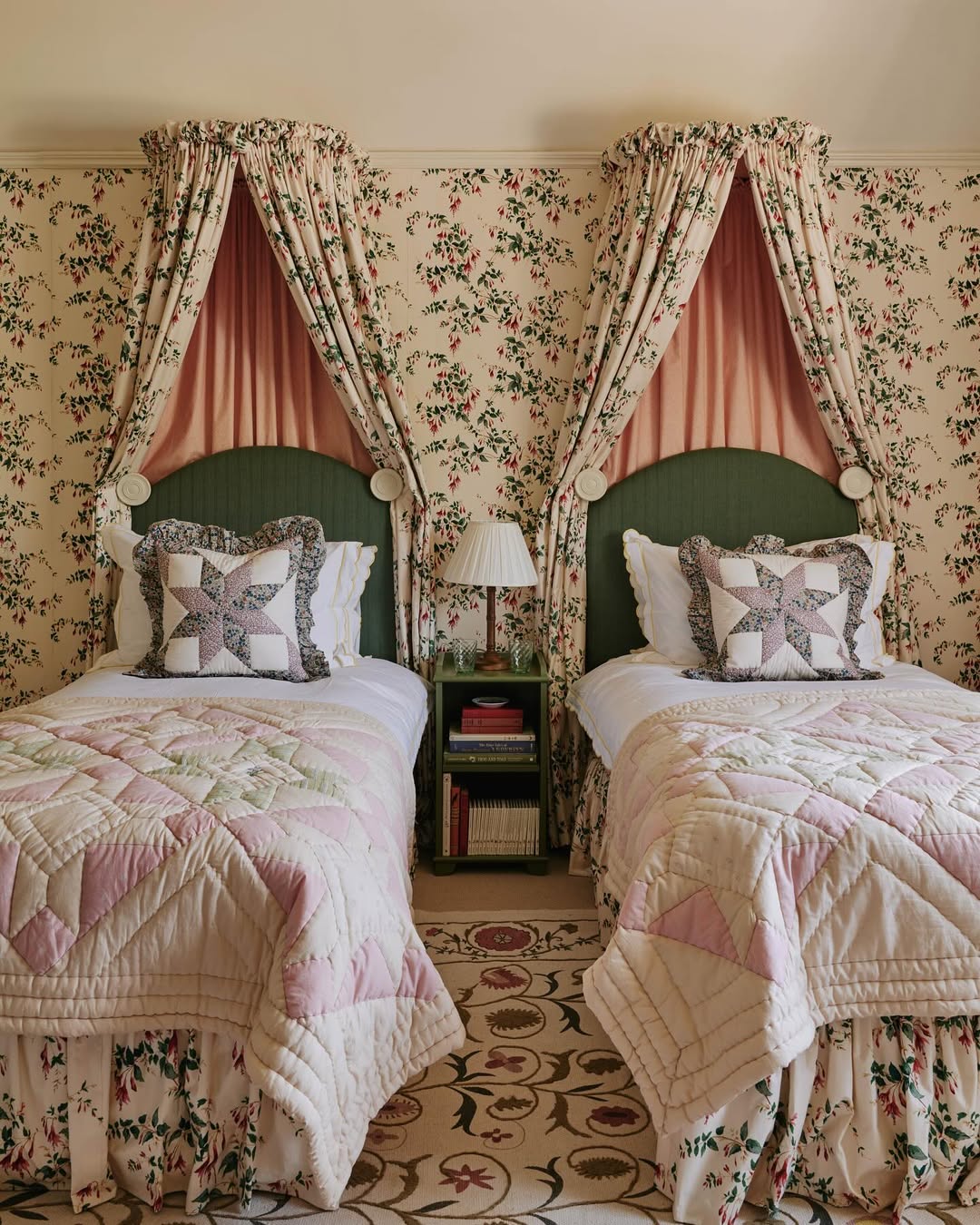Canopied headboards and scalloped curtains frame each bed like a page out of a vintage storybook. Starburst quilts and floral bedskirts bring in a layer of handmade sweetness. That shared green nightstand adds just the right amount of symmetry. Everything’s doubled, yet nothing feels too matchy-matchy.