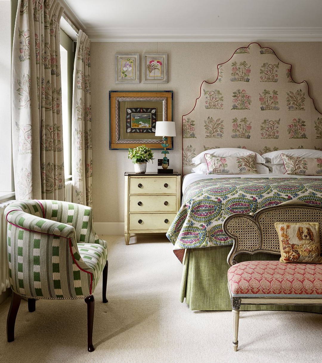 A patterned headboard, layered quilts, and botanical curtain panels tell a story of cottage luxury. The green-check tub chair brings a modern punch to the otherwise antique-leaning palette. Wall art plays with scale and texture without overwhelming. It’s eclectic, but deeply intentional—like a well-read heroine’s favorite guest room.