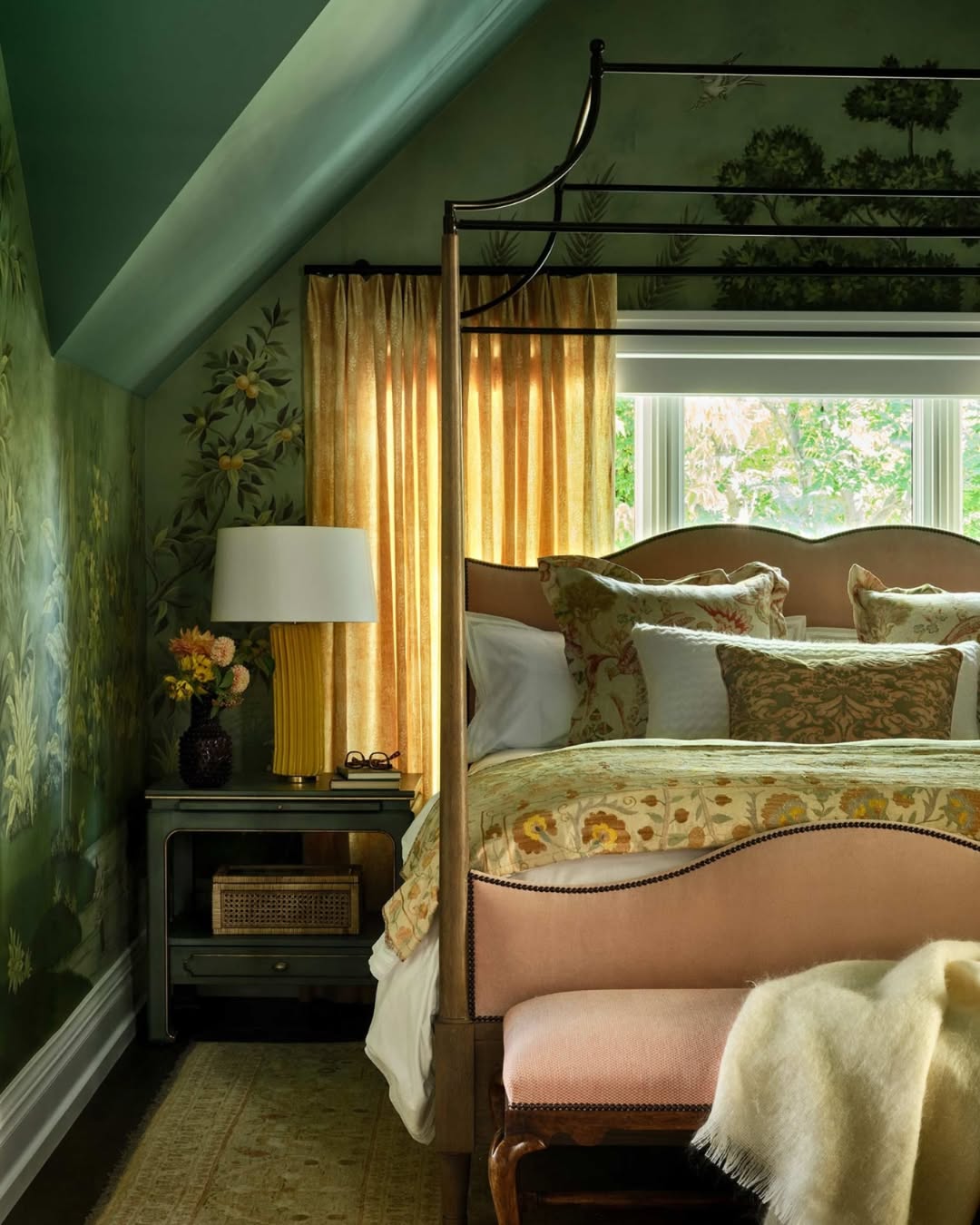 Olive-painted walls and mural-style florals bring this attic space straight into enchanted territory. Gold drapery warms up the deep tones, while the soft rose bed adds romance without feeling too precious. Upholstered layers and botanical prints keep the look grounded. It’s the kind of room that turns reading into ritual.