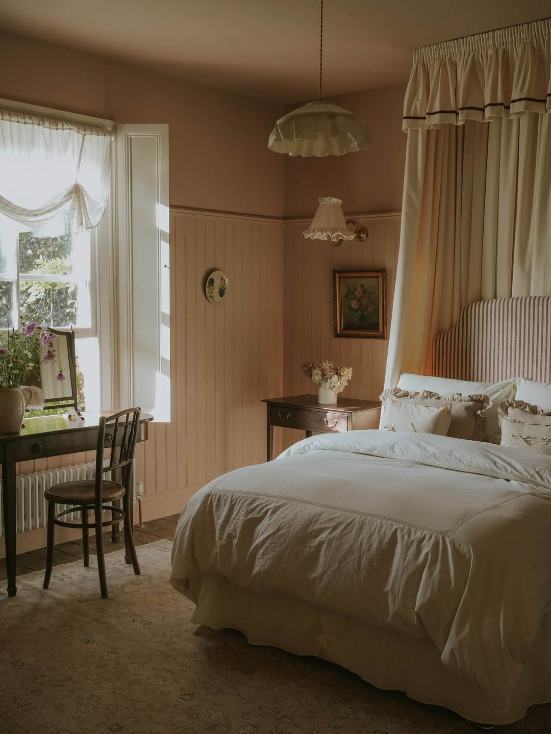 Morning light dances through linen shades and lands softly on ruffled pillows and wood furniture. The stripe-trimmed canopy gives a tailored edge to an otherwise breezy setup. Dusty pink walls and floral artwork reinforce the room’s hush-hush tone. Perfect for curling up, journaling, or just escaping the group chat.