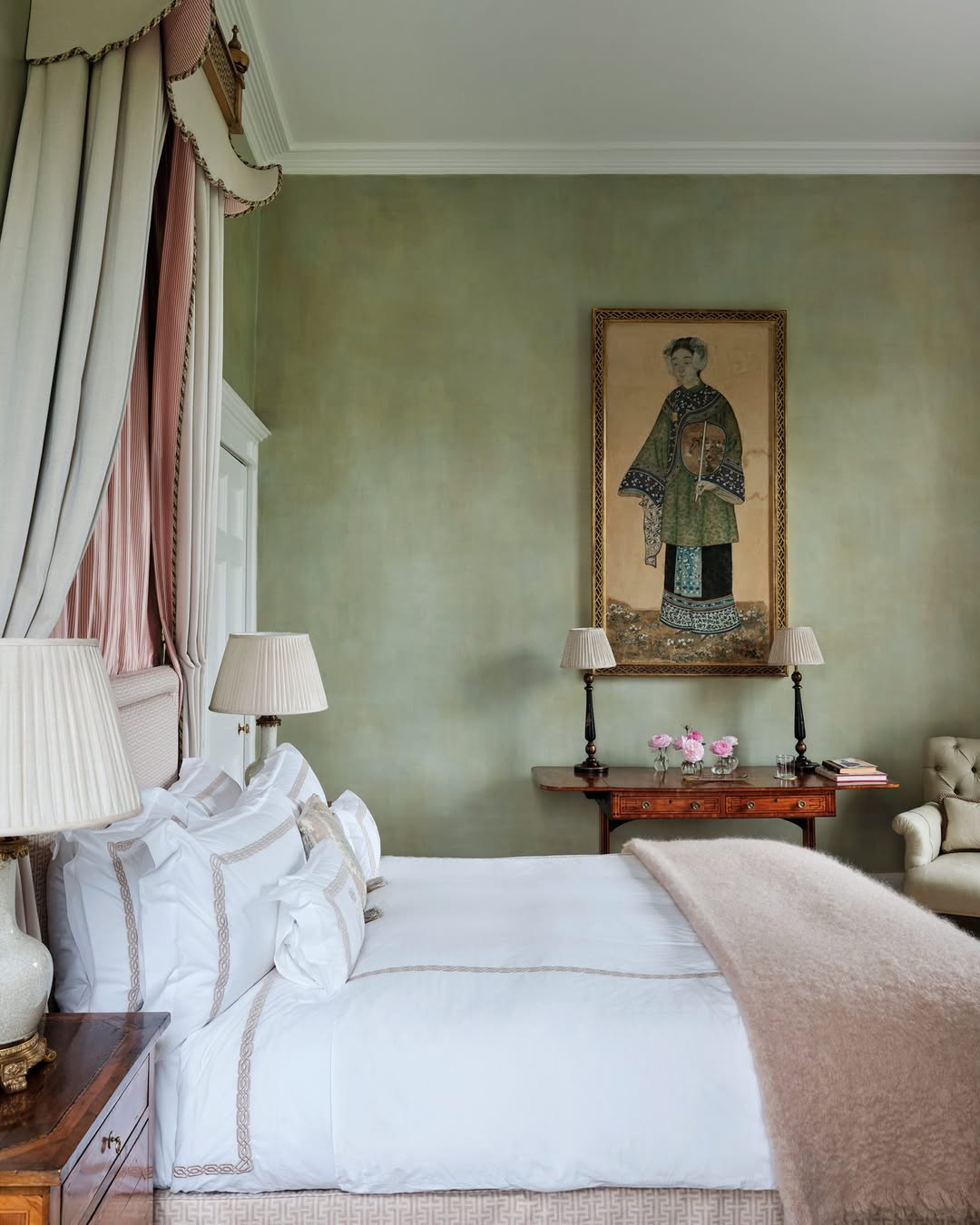 A muted green wash on the walls sets the tone—refined, serene, and just a little mysterious. The large-scale portrait leans academic, while pleated drapes and soft blush accents add a hush of romance. White bedding with tailored trim keeps things crisp. It’s like sleeping in a private wing of a European gallery.