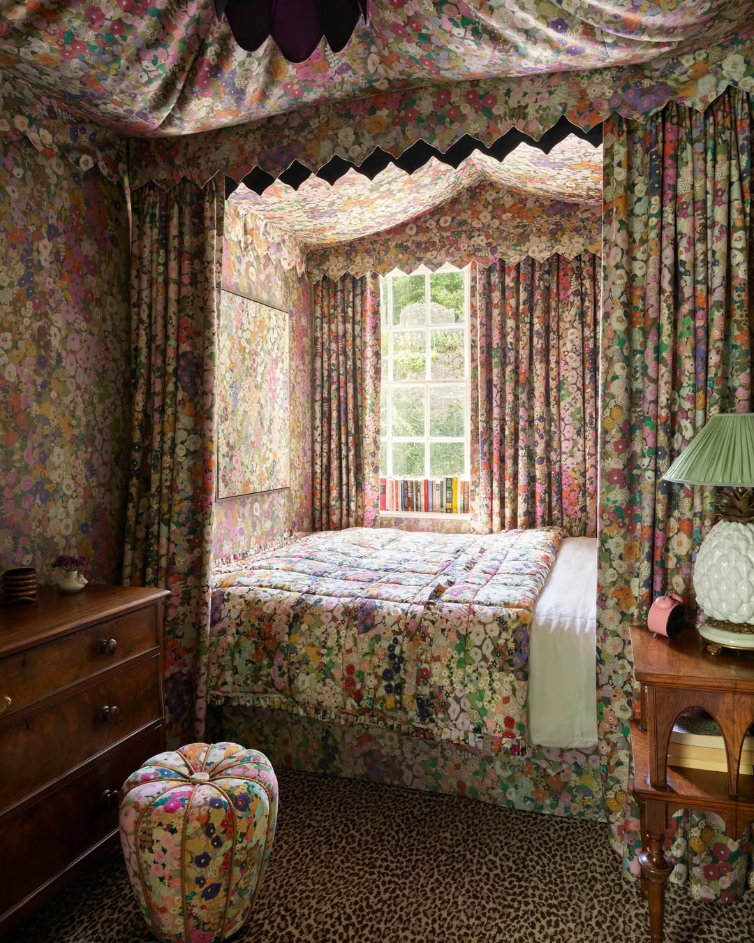 It’s not wallpaper—it’s an immersive experience. Wall to ceiling to bedspread, this print-happy canopy room goes full bloom without flinching. The dainty floral repeat could’ve gone twee, but the leopard carpet and antique wood add just enough tension. If a flower shop had a secret hideout, it would look like this.