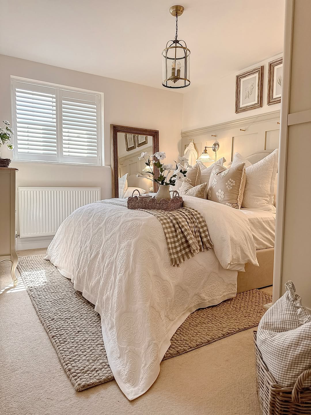 Creamy tones, gingham, and wildflower sketches give this room the gentlest kind of grandeur. The scalloped nightstand and vintage-style sconce add just enough storybook charm. It’s the kind of room that whispers, not shouts. More lady of the manor than queen of the castle—and that’s exactly the point.
