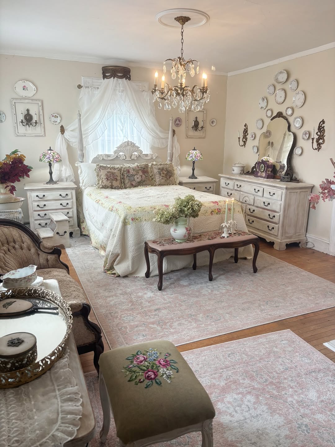 This room leans full-on Victorian tea party—right down to the plate wall. Carved furniture, floral tapestry pillows, and those crystal lamps deliver a cozy kind of grandeur. The netted canopy softens the space without overdoing it. Even the footstool got the embroidery memo.