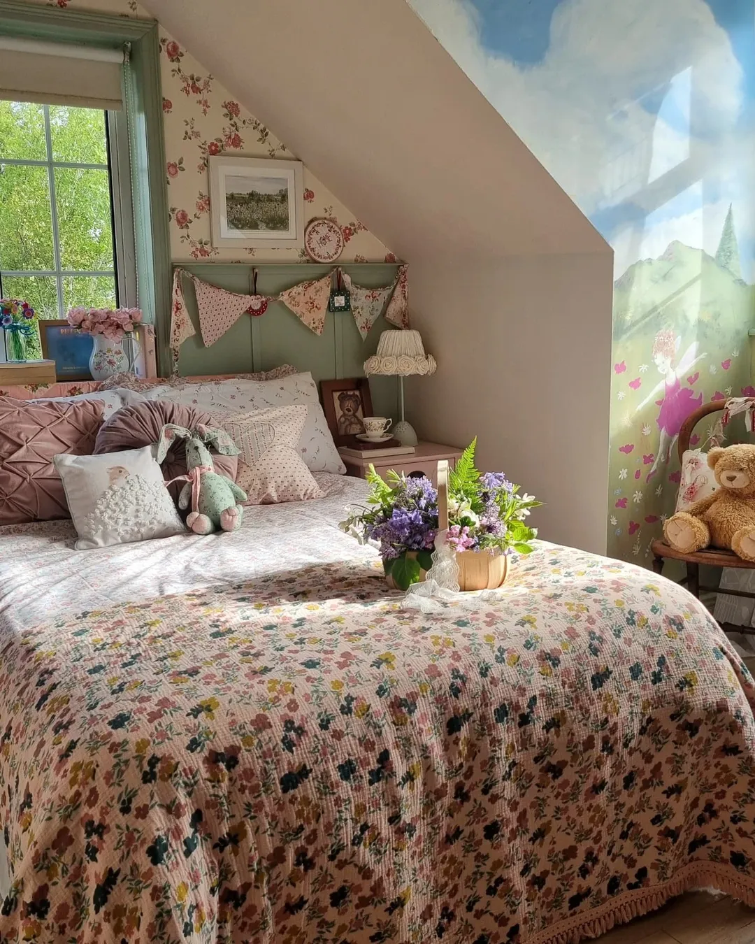 Feels like a storybook attic straight from a Beatrix Potter page. Sloped ceilings get the royal treatment with bunting, rose-print wallpaper, and that hand-painted mural—hello, flying fairy. The layered textures and playful prints don’t just charm—they cocoon. Bonus: built-in sunlight makes the florals pop.