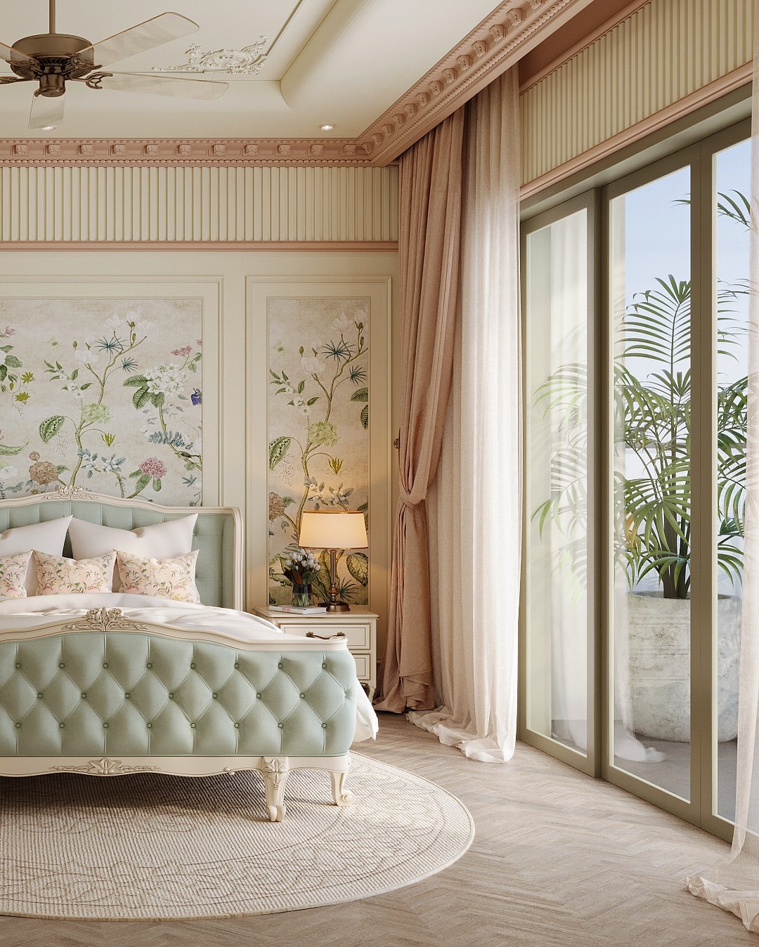 Chinoiserie panels set the scene, but it’s the seafoam tufted bed that really seals the deal. This bedroom trades clutter for elegance, letting ornate legs and floral fabrics do the talking. Creamy drapes and pale herringbone floors keep it fresh, not fussy. Think castlecore with a side of calm.