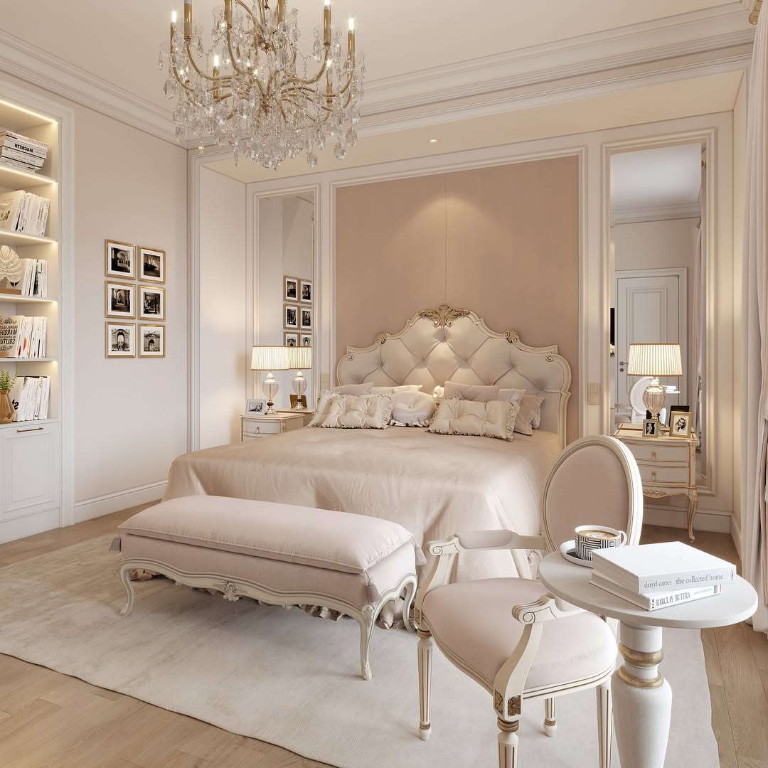 Blush tones, tufted textures, and gilded trim serve up an ultra-feminine take on castlecore glam. Every piece is tailored to perfection—from the carved legs to the ruched pillows. The built-in bookshelves and crystal chandelier strike a sweet balance of beauty and brains. Think château, but make it editorial.