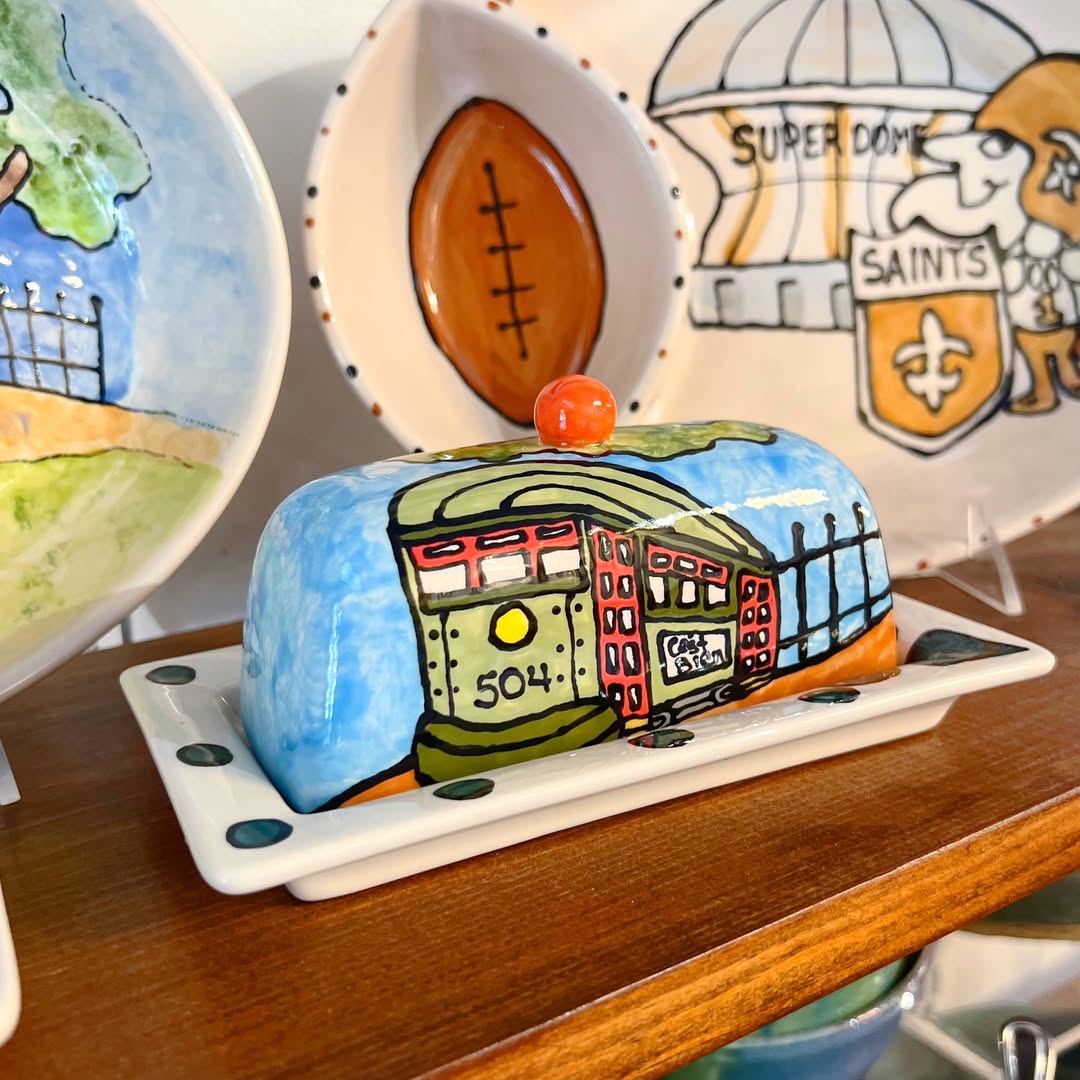 Local pride meets countertop function in this playful homage to New Orleans’ 504 line. The bold, hand-drawn style channels folk art energy, complete with a cherry-red knob and polka-dotted base. It’s not just for butter—it’s for anyone who wants a side of culture with their carbs.