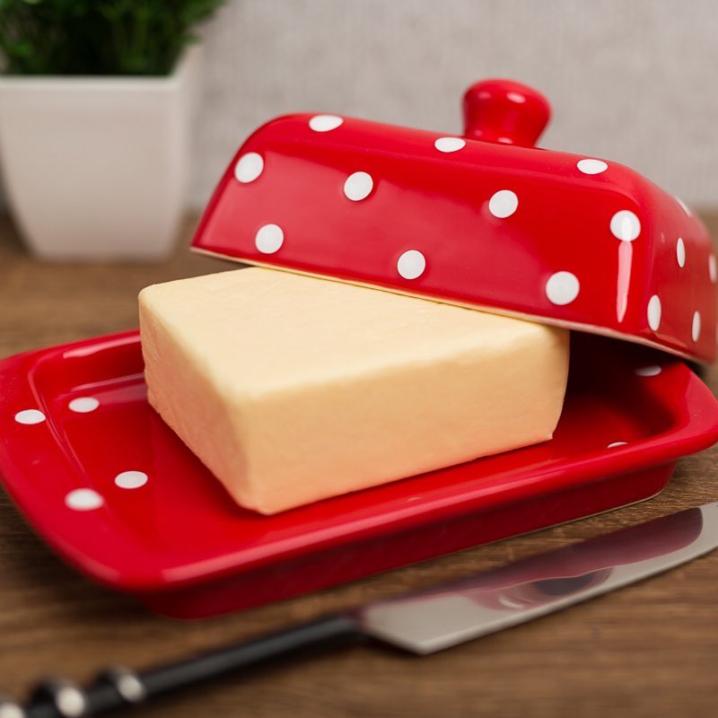 Red, bold, and covered in polka dots—this butter dish brings retro diner vibes to the breakfast table. The high-gloss finish and playful pattern make it feel straight out of a 1950s lunch counter. It’s cheerful, functional, and impossible to miss in a sea of neutral serveware. Call it butter with personality.