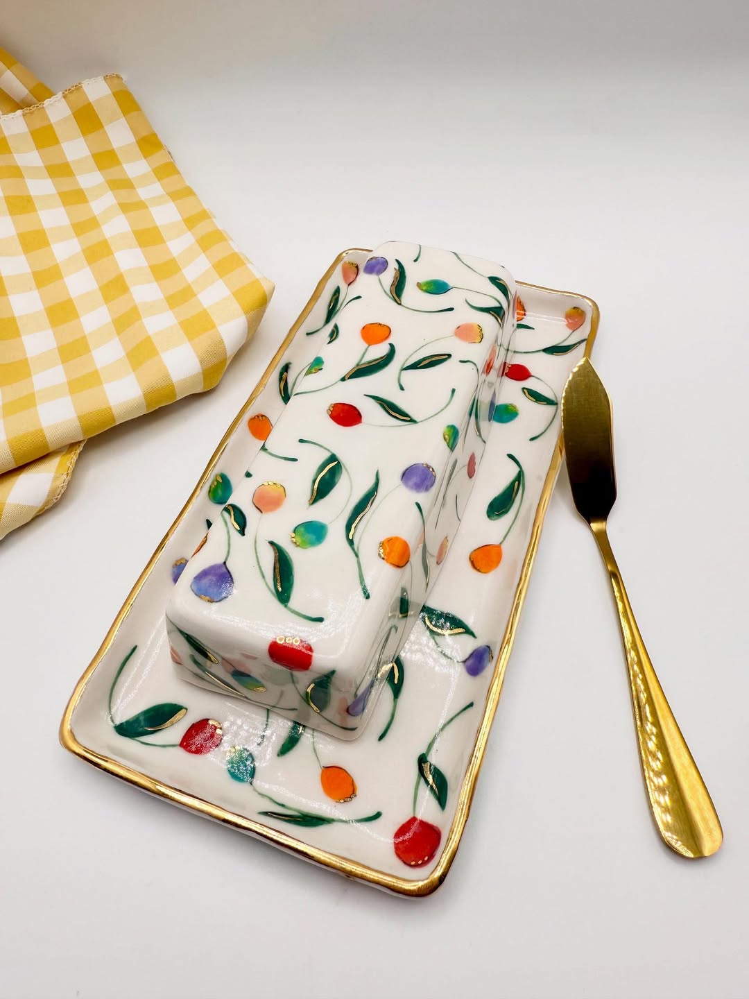 Hand-painted florals in bold, juicy colors dance across this butter dish like confetti on porcelain. Gold accents trace the leaves and rim, adding just enough luxe without tipping into too-fancy-for-everyday. The long rectangular shape feels fresh—more brunch buffet than farmhouse table. It’s floral, fun, and quietly fabulous.