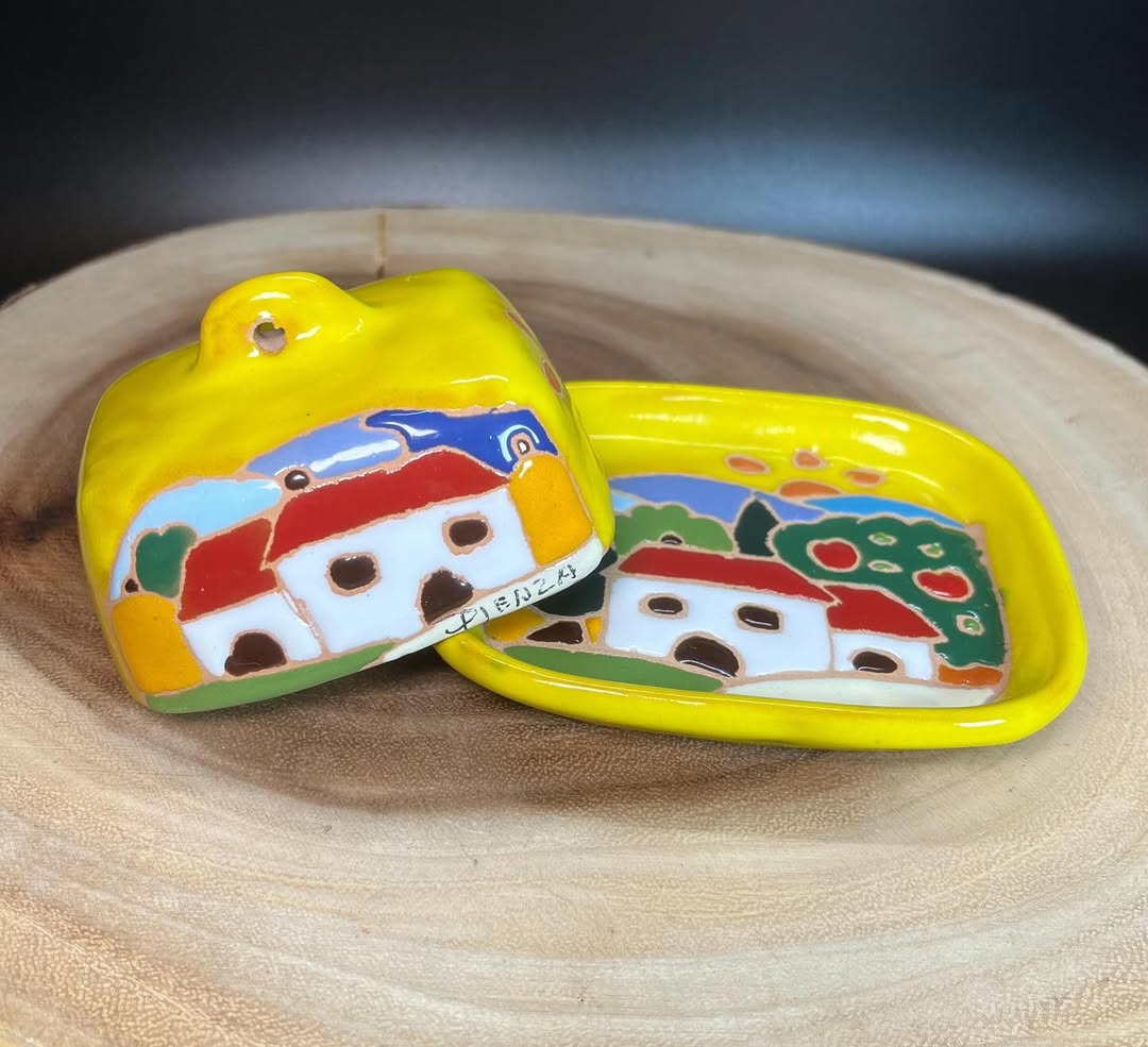 Bright yellow glaze sets the tone for this Mediterranean-inspired butter dish, painted with red-roofed cottages and lush hillside trees. The stylized brushwork and bold colors feel like a postcard from a summer escape. Even on gray mornings, it brings a pop of warmth—and just enough kitsch to keep things fun.