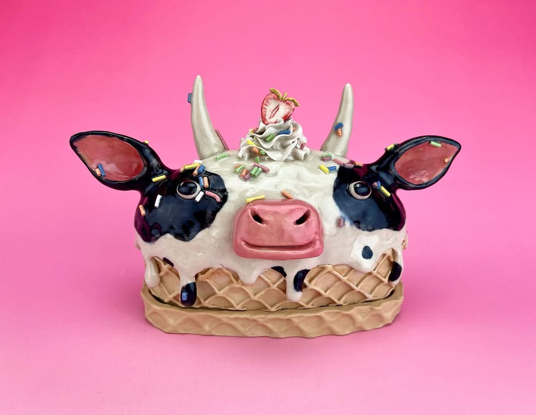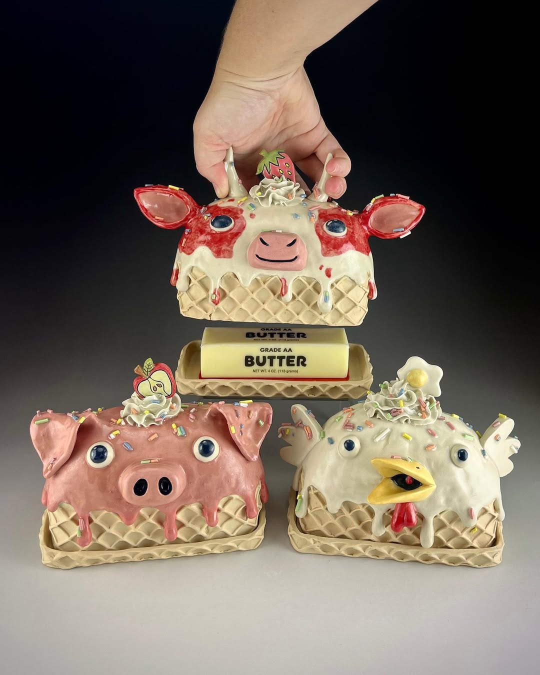Waffle cones meet farm animals in this trio of butter dishes that look straight out of a candy-coated cartoon. Each one—cow, pig, and chicken—is topped with frosting drips, rainbow sprinkles, and a dessert-inspired garnish (yes, that’s a fried egg on the chicken). The vibe? Dairy barn meets ice cream parlor. It’s weird, wonderful, and way more fun than it has any right to be.