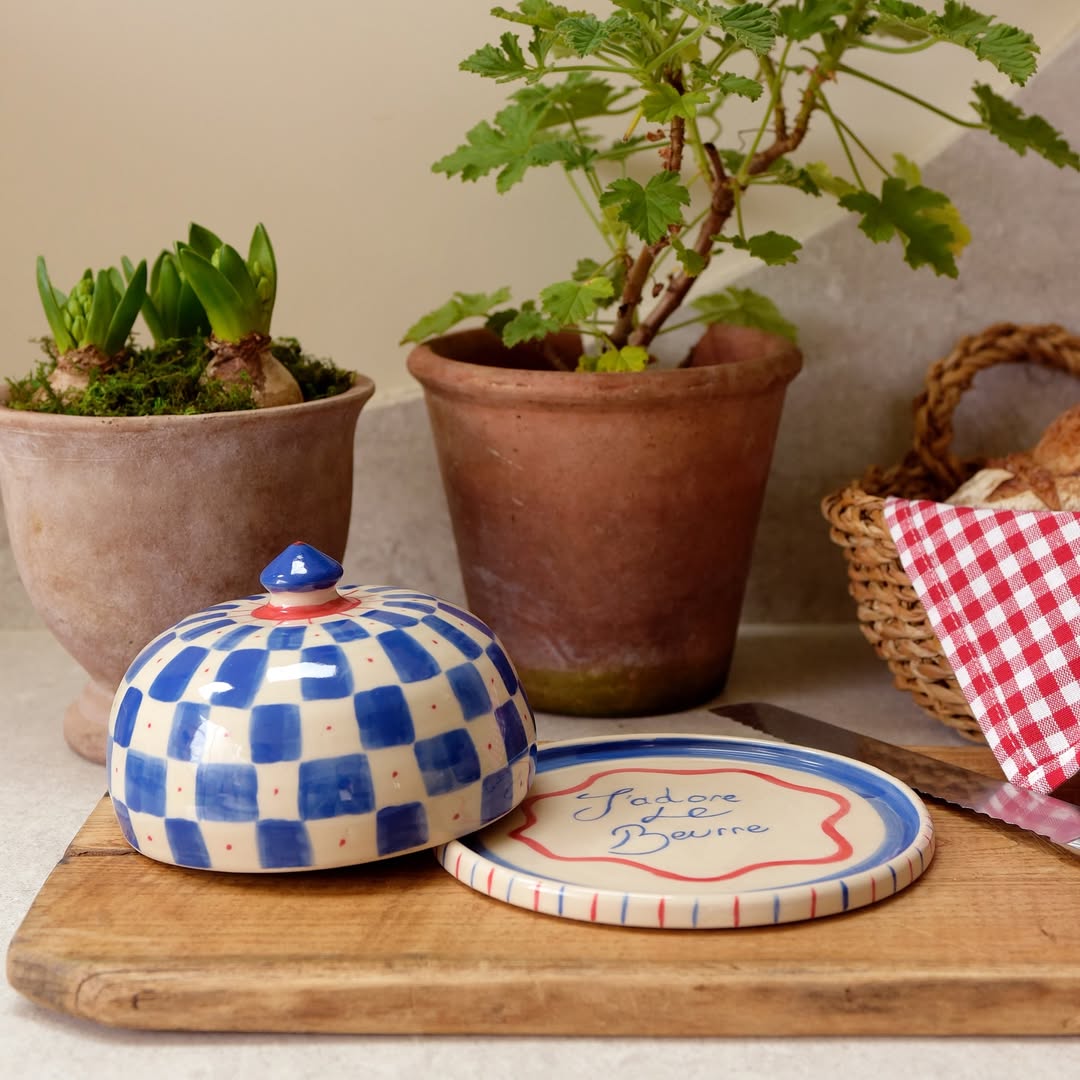 Blue gingham checks and handwritten script give this butter dish big countryside charm. The words J’adore le Beurre say what we’re all thinking, and the cloche-style lid adds a market-day touch. It’s unfussy but full of character—the kind of piece that turns a slice of bread into a moment.