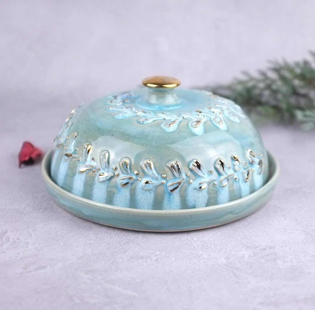 Soft aqua tones flow over this butter dish like watercolor, but it’s the raised gold detailing that truly steals the scene. Leaf-like flourishes wrap the dome in a quiet, luminous rhythm—elegant without trying too hard. The kind of piece that whispers “heirloom,” not “kitchen clutter.”