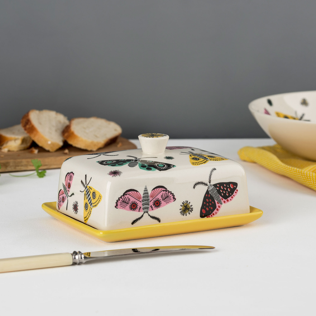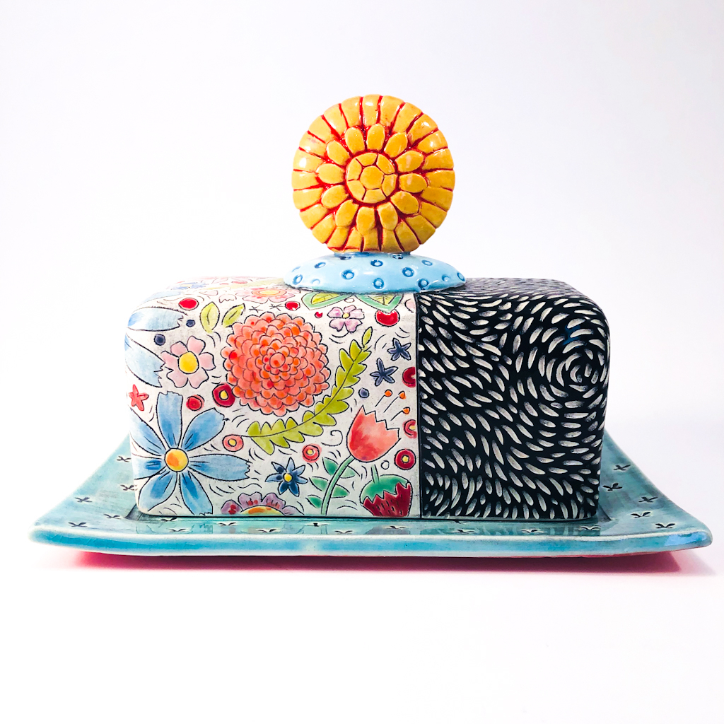 Bold doesn’t begin to cover it. From folk-style florals to a high-contrast swirl of black and white, this butter dish is a maximalist’s dream. The oversized sunflower knob gives it instant gallery cred—sculptural, sunny, and impossible to ignore. Why blend in when you can serve butter on something this brilliantly busy?