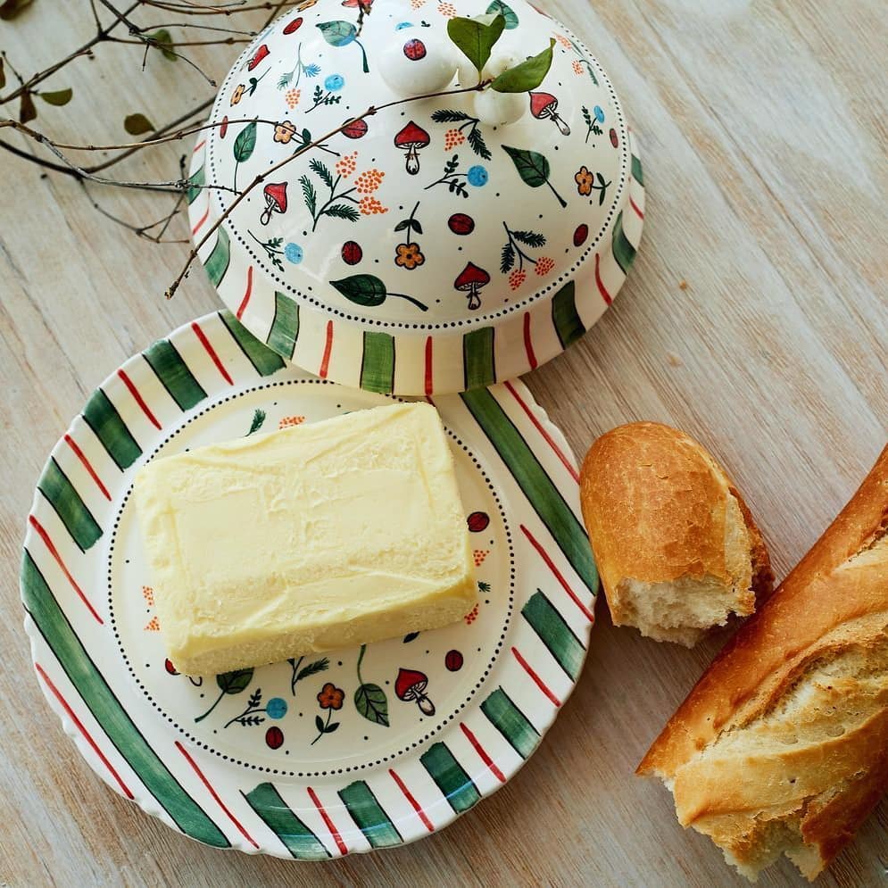 Toadstools, berries, and leafy sprigs make this butter dish feel like it wandered in from a storybook picnic. Hand-painted stripes in red and green frame the scene without overpowering it. The dome shape keeps things classic, but the whimsical pattern? Totally charming. Butter storage, but make it woodland-chic.