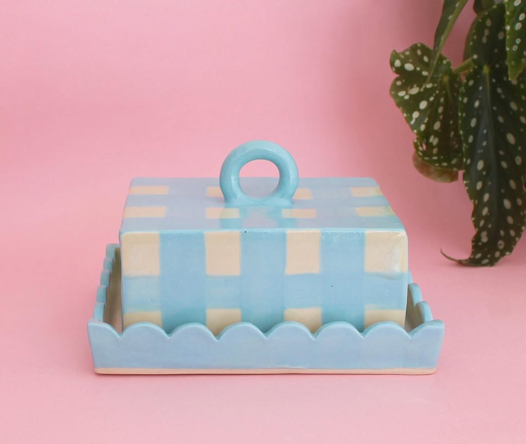 Pastel blue checks, scalloped edges, and a ring-handle top—this butter dish is serving cottagecore realness. The squared-off shape feels modern, but the picnic-blanket pattern keeps it grounded in sweet nostalgia. It’s basically spring brunch in ceramic form.