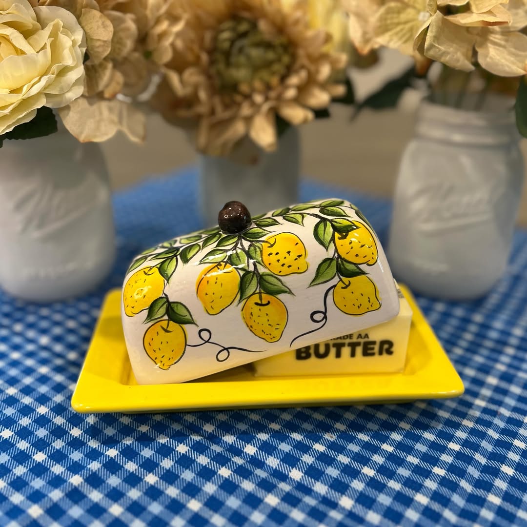 Lemons, leaves, and a little whimsy—this ceramic butter dish goes full Tuscan farmhouse. The hand-painted citrus pop against the white lid, while the bright yellow base ties it all together like a sunbeam on your breakfast table. Bonus points for the cherry-like knob on top—practical and playful. Skip the plain dish; go for one that brings actual zest to your spread.