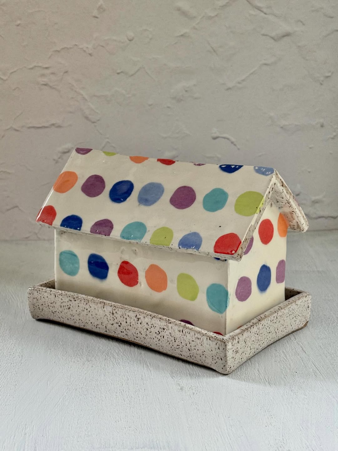 Shaped like a little house and splashed in rainbow dots, this butter dish is half playful sculpture, half countertop joy. The speckled stoneware base gives it grounding texture, while the tilted roof adds charm you didn’t know your butter needed. Who knew dairy storage could be this fun?