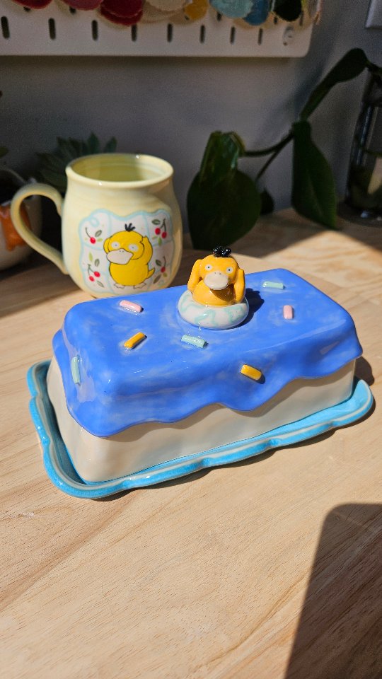 Wavy blue glaze, pastel sprinkles, and a lounging Psyduck floating in the center—this butter dish might just be the most laid-back kitchen accessory ever. The sculpted Pokémon adds a splash of nostalgia, while the watery color palette brings serious summer vibes. Proof that butter can be both quirky and cool.